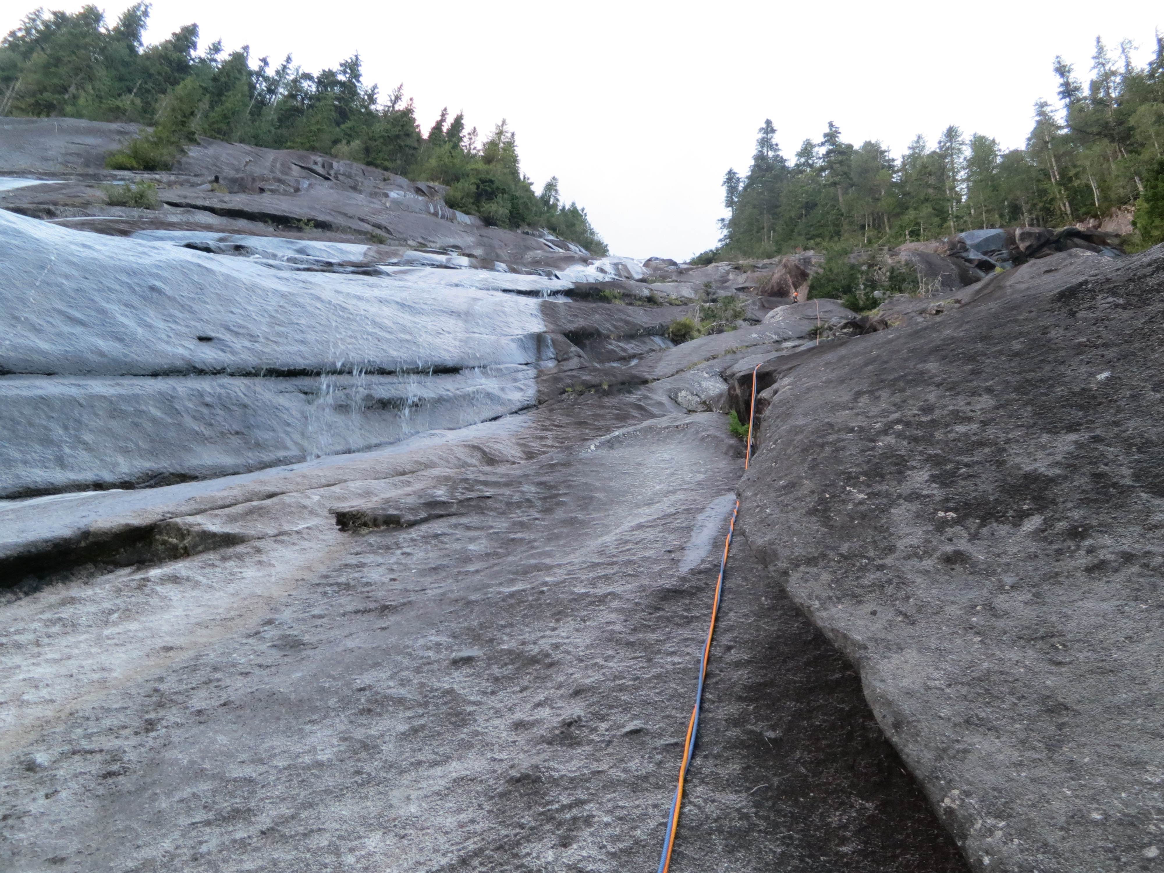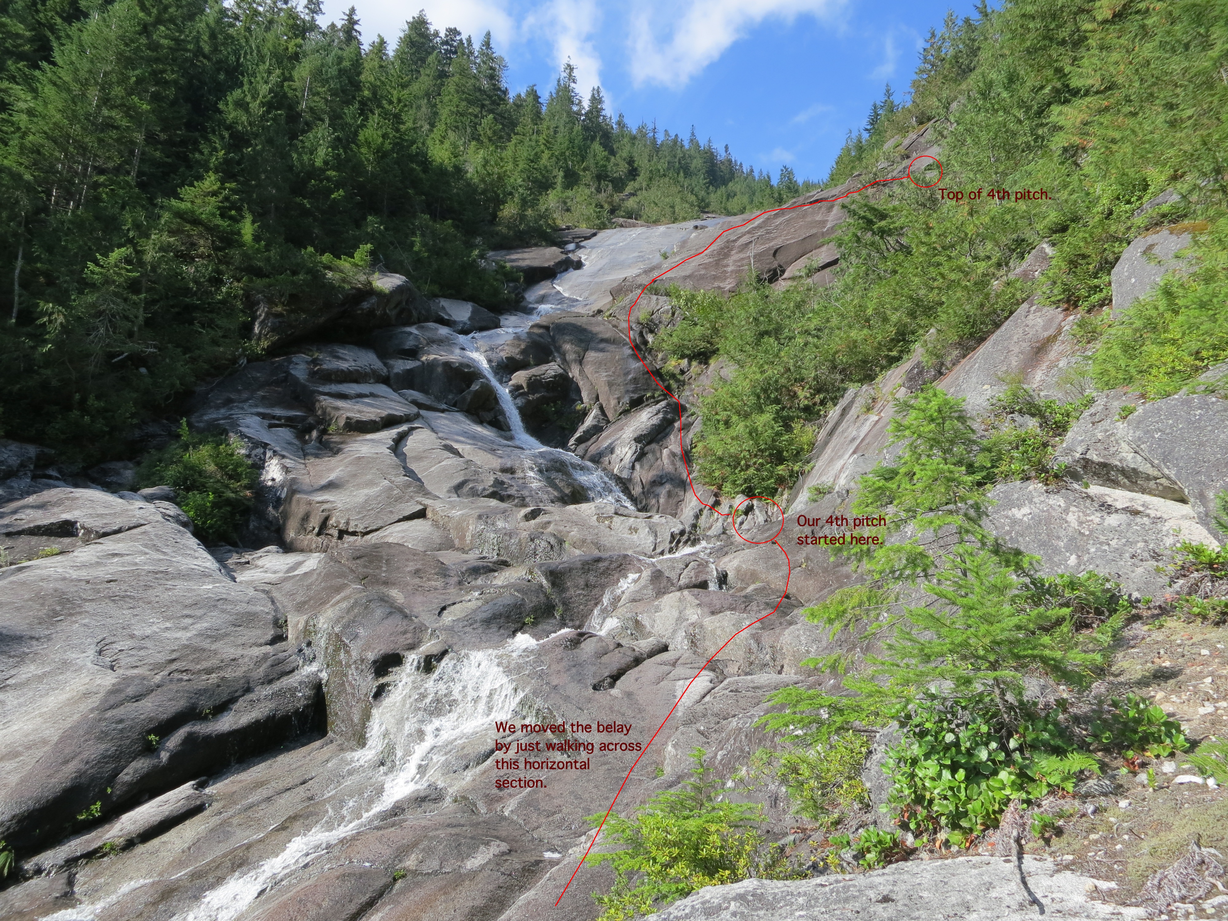 This would be a fine place stop & turn around for anyone who might repeat our route, since it’s rewarding, and it’s got a pleasant view of a part of Otter Falls you can’t see until you’re up here. We were curious what came next though, so we had to try out a 4th pitch to see if it was any good. This required moving the belay horizontally upstream about a rope length. Our 4th pitch elbowed out quite a bit to climber’s left. Getting up to that elbow point was the hardest climbing of the day, mostly because it was the only part of our Otter Falls route that wasn’t dry.