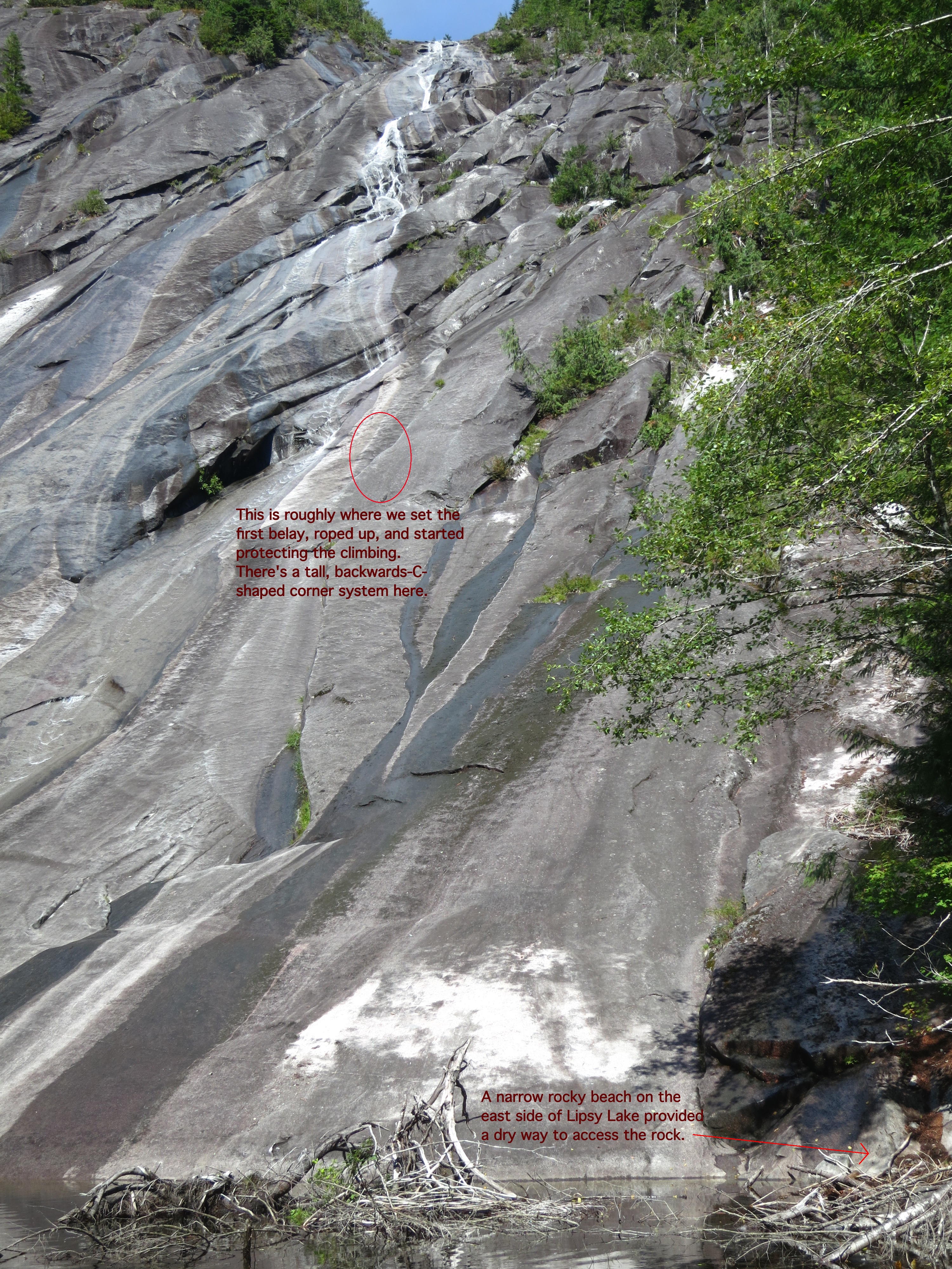 We geared up on the shore of Lipsy Lake, donning harnesses, rock shoes, helmets, & the rack; but we carried the ropes still-coiled until we set a belay anchor at the bottom of our first pitch. Gerry and I each brought a rope (his was 70m, mine was 60m) so that we’d be able to do full-length rappels later on. There’s just enough of a rocky shore on the right (east) side of Lipsy Lake to get onto the main rock face with dry feet. Once on the friction slab, it starts out lower-angle than it looks, and with rock shoes on you can simply walk up it with confidence (Gerry’s done this part before in just sandals.)