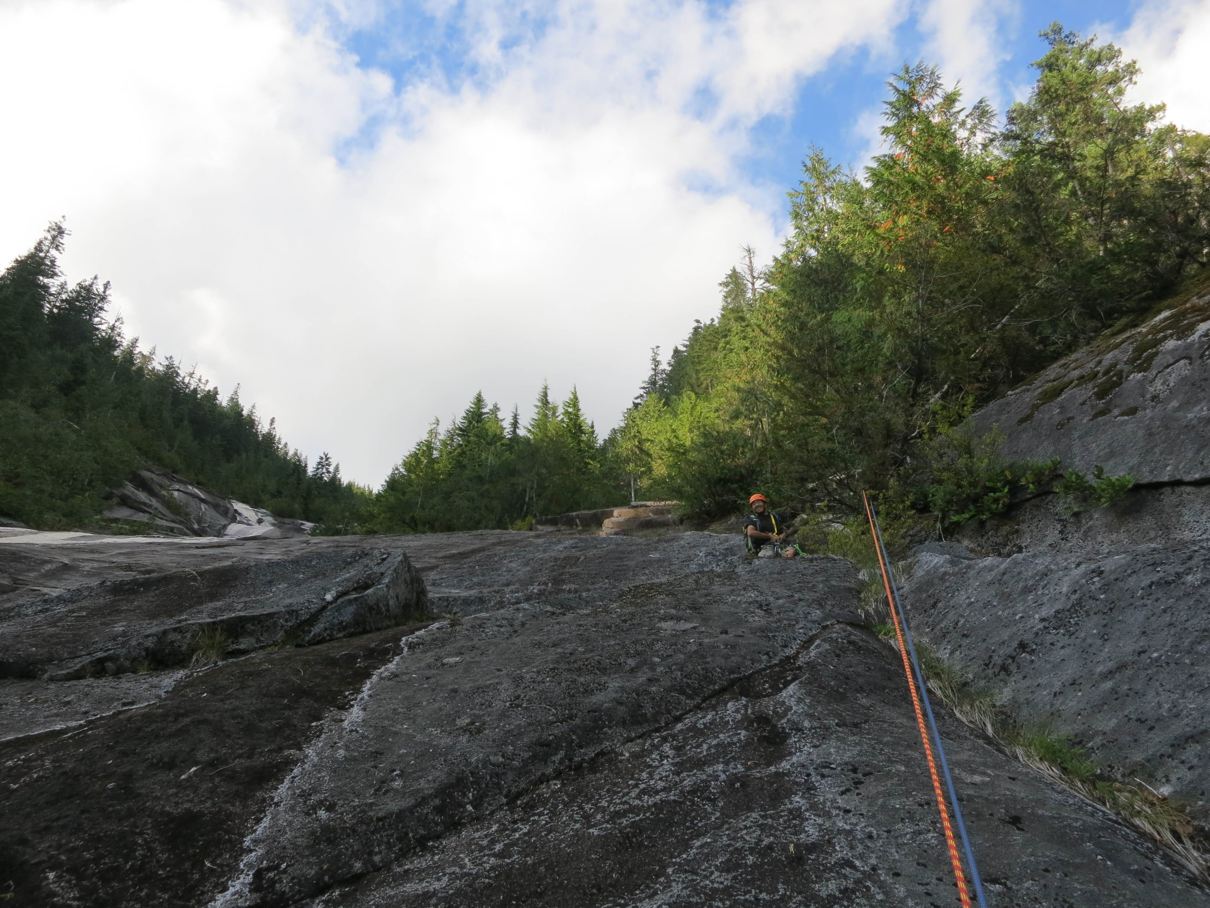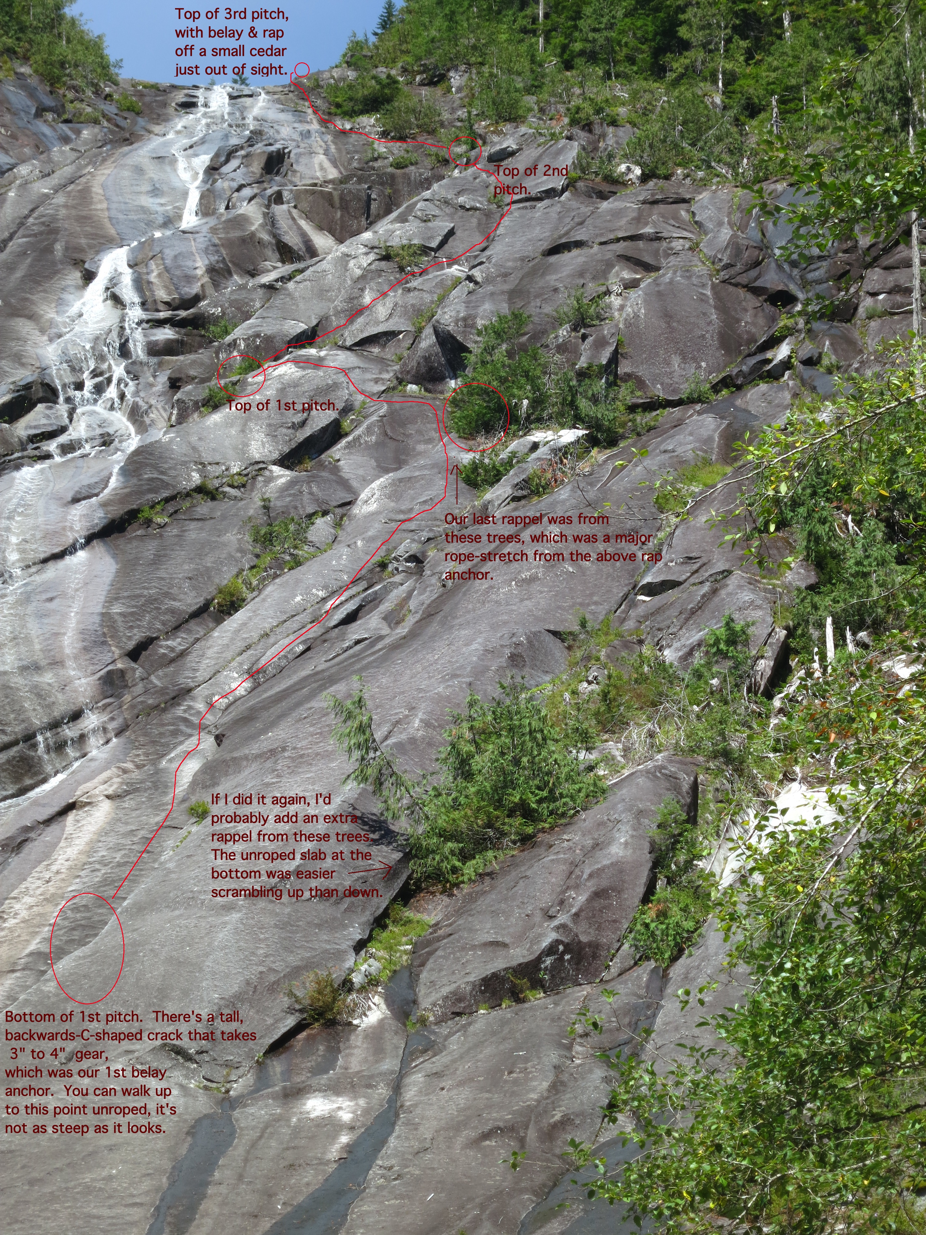 I led, and the climbing was all less-than-vertical friction slab. I’d call it a 5.5 or lower, it was slightly easier than the first pitch or two of R&D in Leavenworth. It was pretty run-out between protection opportunities, but the climbing was easy enough for me to still feel comfortable with it. Half my pro placements were girth hitches around small cedar trees that were sticking out of the rock here and there, so I was constantly using the three double runners I brought, but there was also the occasional crack I could plug a cam or tricam into. Black Diamond C4 sizes #0.3 through #3 were useful, but definitely just singles of them, since you don’t get that many places to place them. We did three pitches, all ending at small cedar trees for belays, each almost a full rope length, to get to the top of Otter Falls as it would be visible from someone standing at Lipsy Lake.