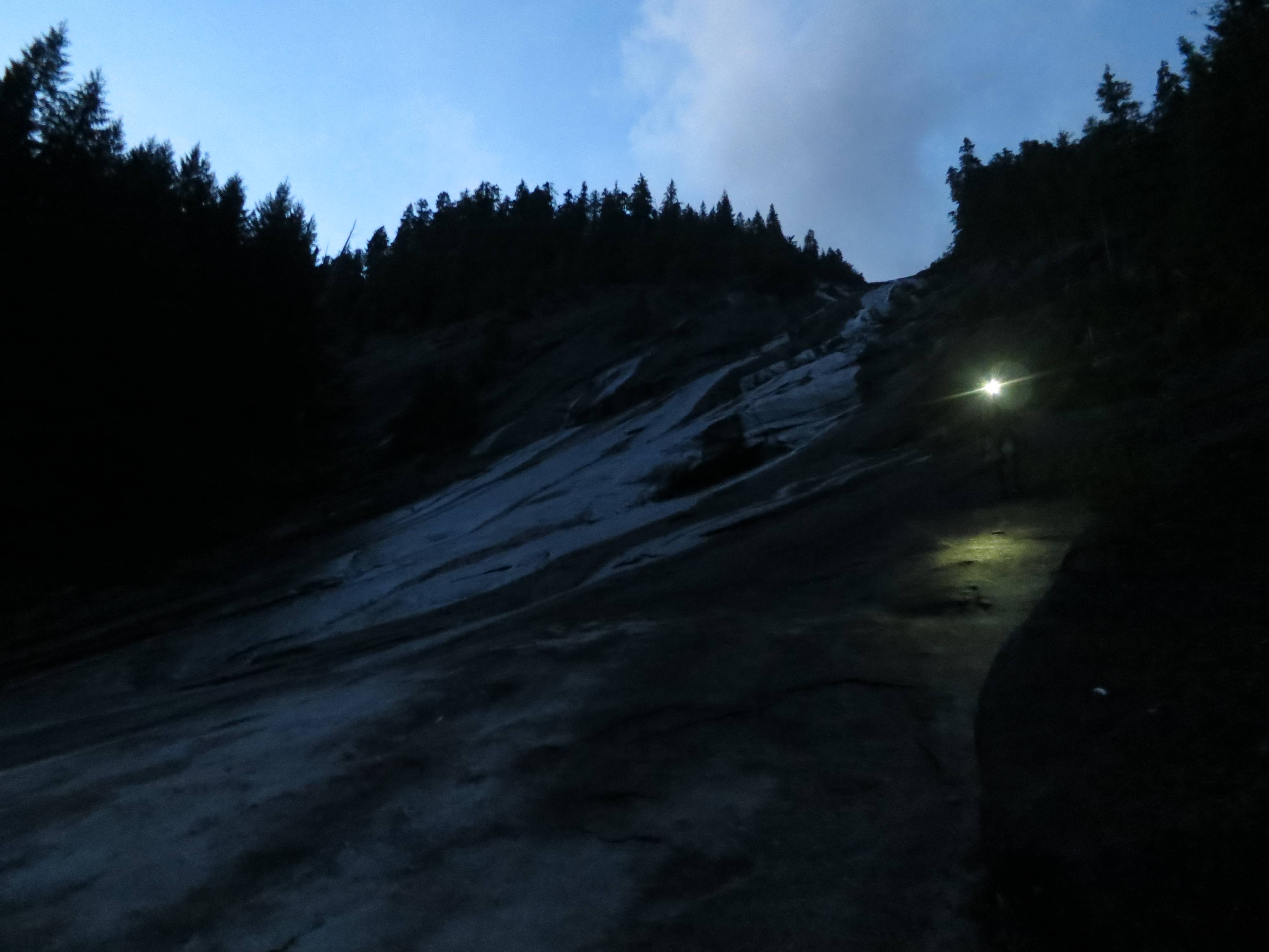 We ended up back in the tall backwards-C-shape at 7:30, with dusk setting in. But, on the bright side, my belay device had rolled to a halt there, so I got it back! We coiled the ropes, and gingerly did the rest of the friction slab to the bottom unroped. If I were to do this again (and had more time before dusk,) I would have swung to climber’s right while rappeling our 1st pitch, and tried to reach another cluster of cedars so I’d have an option of rappelling all the way down. That bottom unroped scramble was easier going up than it was going down. Plus, I was feeling a bit drained of energy by the end of the day, and I would have felt more protected from a tired misstep if I could rappel it rather than scramble it. Anyway, we were finally back to our packs on the shore of Lipsy Lake a little after 8pm, and it was completely dark out shortly after that.