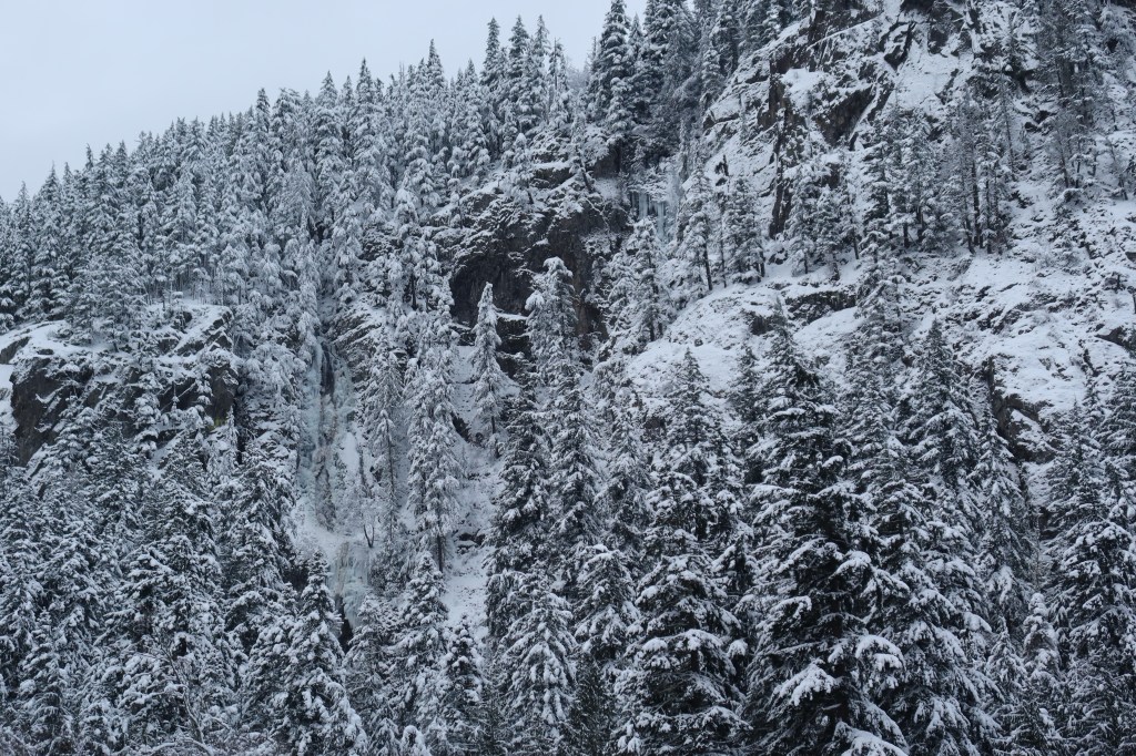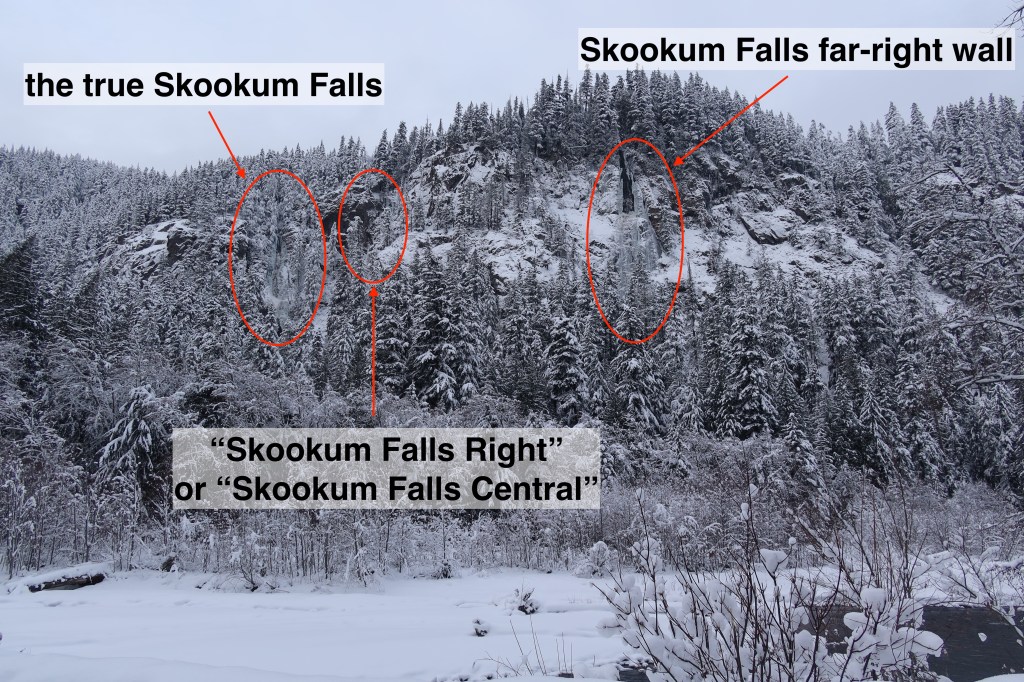 It’s worth driving to the Skookum Falls Viewpoint (47.05290, -121.57210) on Hwy 410 first and taking a look at the ice routes from there. I had packed binoculars for this, but they weren’t that necessary after all, the things you’re looking at are only a half-mile away, and fairly big. The true Skookum Falls waterfall, which people take pictures of in the summer months, is the one on the far-left, in a bit of a recess in the cliff. About 200 or 300 feet right of that, hidden in even more of a recess, is another flow that I’ve heard referred to as either “Skookum Right” or “Skookum Central” in various other descriptions. A full 1000 feet right of the namesake Skookum Falls, another lower-volume flow of water on a more broad and openly visible rock face creates a much more eye-catching wall of ice, which we’ll call “Skookum Far Right”, even though I feel like it almost deserves it’s own name. Anyway, it looks like the majority of the trip reports on CascadeClimbers.com, as well as the current single description on Mountain Project, are all referring to only this “Skookum Far Right” wall. The photo of Skookum Falls in the “Washington Ice” climbing guidebook by Krawarik and Martin is of one of the other flows: either the original Skookum Falls on the left, or its neighboring “Skookum Central” gully.