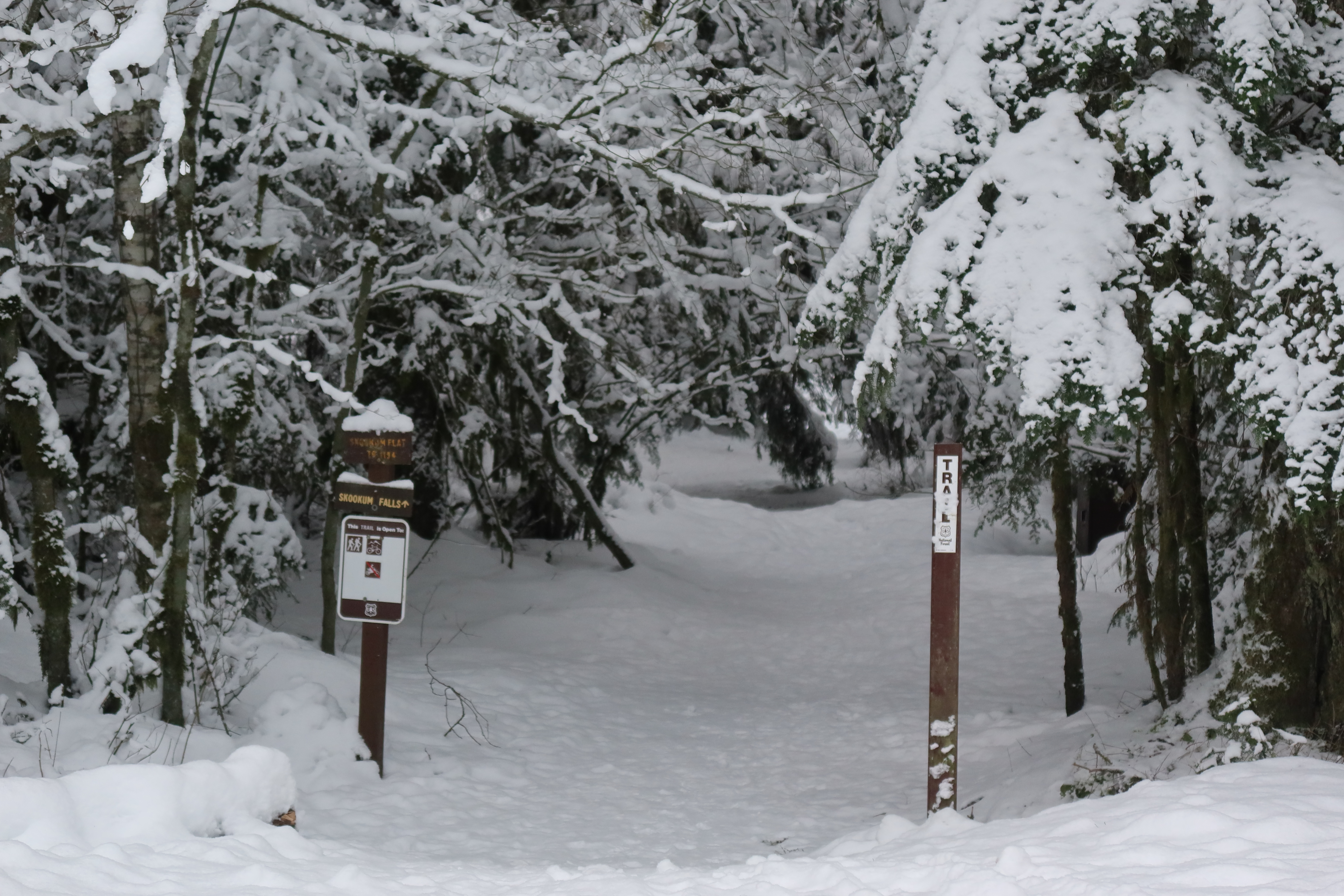 We’d heard plenty about people parking at the Skookum Falls Viewpoint on Hwy 410, and finding a way to cross the river from there. However, the alternative is parking 2 miles north, on Forest Road 73, at the “Skookum Flats North Trailhead,” and walking a flat and easy trail through the forest. (47.07796, -121.58586. Requires NW Forest Pass.) We opted to just accept the slightly longer distance to avoid any shenanigans or questionability of trying to cross the river. We also didn’t see any logs across anywhere within eyesight from the Skookum Fall Viewpoint, but admittedly we weren’t looking very hard since we had already mentally settled on taking the trail. Compared to what I’m used to hiking on for alpine climbs, the trail felt incredibly civilized: flat, straight, easy to follow, with a mere 2″ of snow, and even that had already been packed down by someone else. Luxurious.