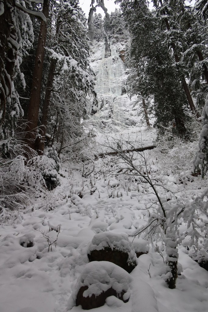 After 40 minutes on the trail, (and one army-crawl under a blowdown,) Chris & I arrived at some very prominent flagging tape hanging from tree bough. We were directly underneath “Skookum Far Right”, with a wide-open swath through the forest giving us a perfect view up at it. Getting up that open swath was a bit trickier though, especially after we had been lulled by the nice trail until then. It took us another 25 minutes to gain that 200′ up through snow-covered rocks, logs, & devils club. We stopped at the last big tree on the right to transition and gear up for the actual ice climb! (47.05237, -121.57610)