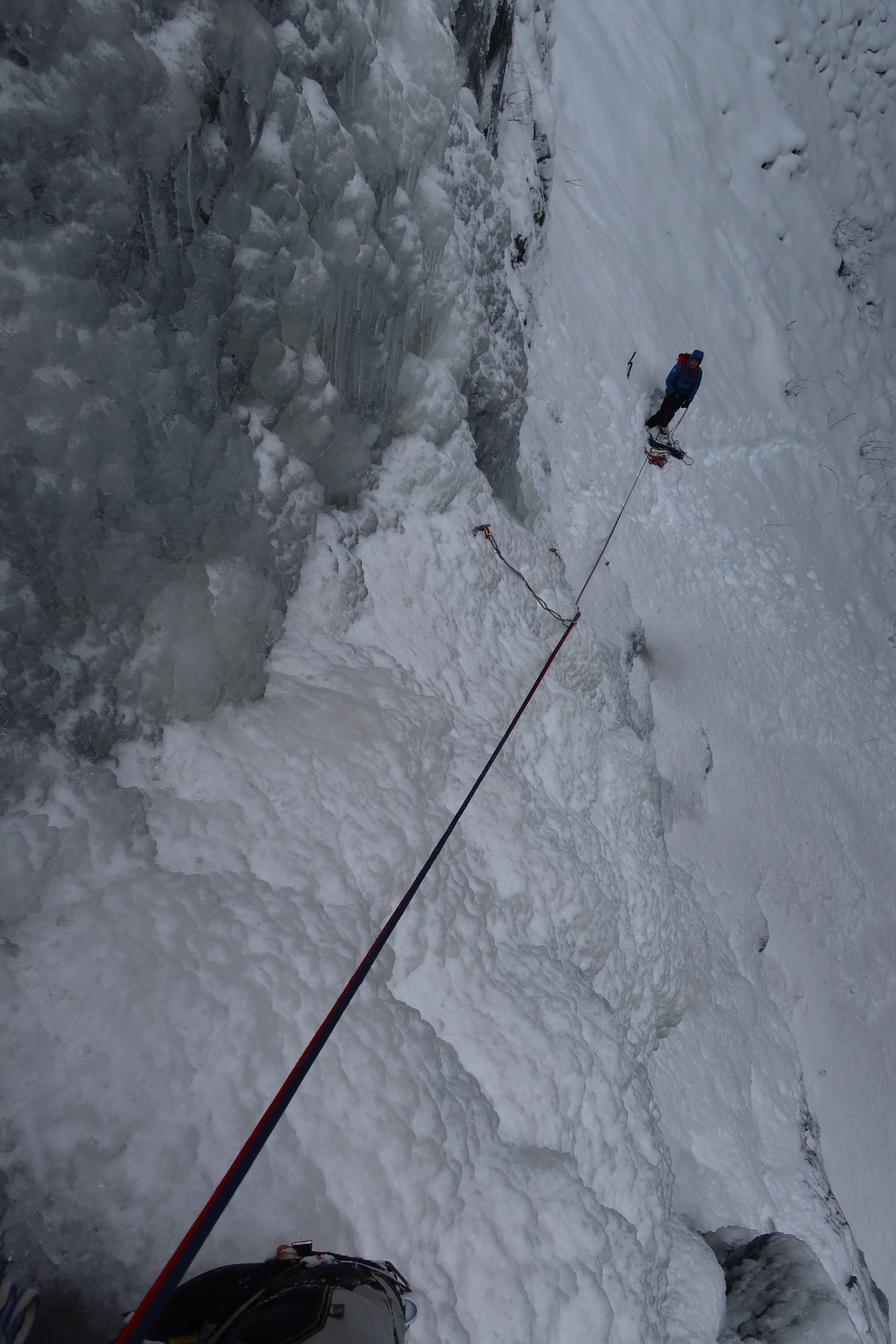 Despite the pro, his climbing looked great, and he made solid work of the pitch, disappearing up and right out of sight and earshot, ultimately using every foot of the 60 meter ropes. I tried yelling to him about being out of rope, but there was no response, and I’m pretty sure he couldn’t have heard me. I figured he’d be searching for a belay anchor, and since I was a on a relatively comfortable ledge, I broke down my anchor and simuled a bit along with any further rope movement, in case he needed a little more. I only moved about 10′ from where my anchor had previously been when the ropes stopped moving all together for quite a long time, much longer than normal anchor-building time. I stood and waited, and began to get rather chilly, and kept wishing for the ropes to get moving again. Eventually, I heard a distant climbing command yelled by Chris, it was really good to hear that he was anchored and that I was on belay so that I could get climbing. Body heat came back quickly as I cruised up the pitch, and when I joined him at the top, I could see what all the delay was about: there really was no good option for a belay anchor anywhere around. A lot of the ice was still much thinner than it looked, but he did a great job working something out anyway, combining three shallow screw placements.