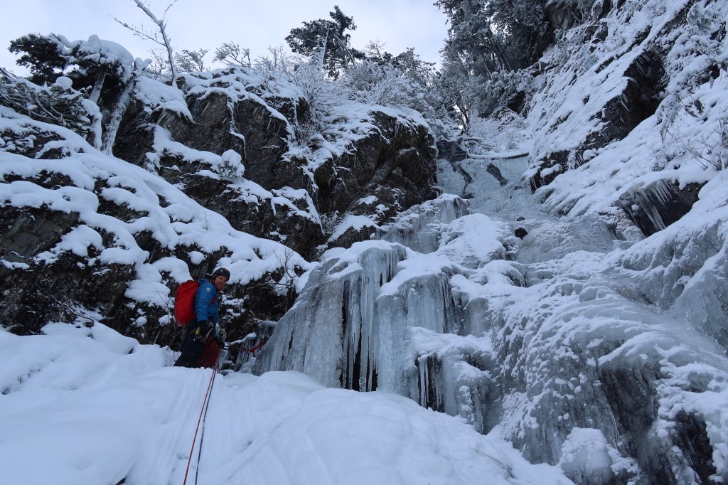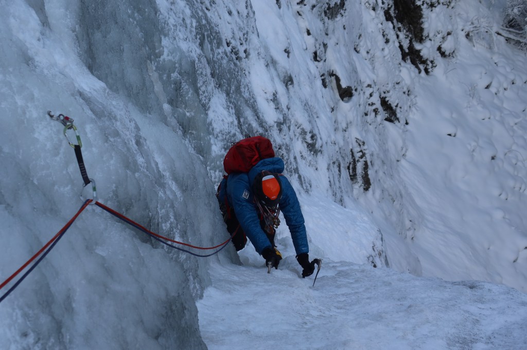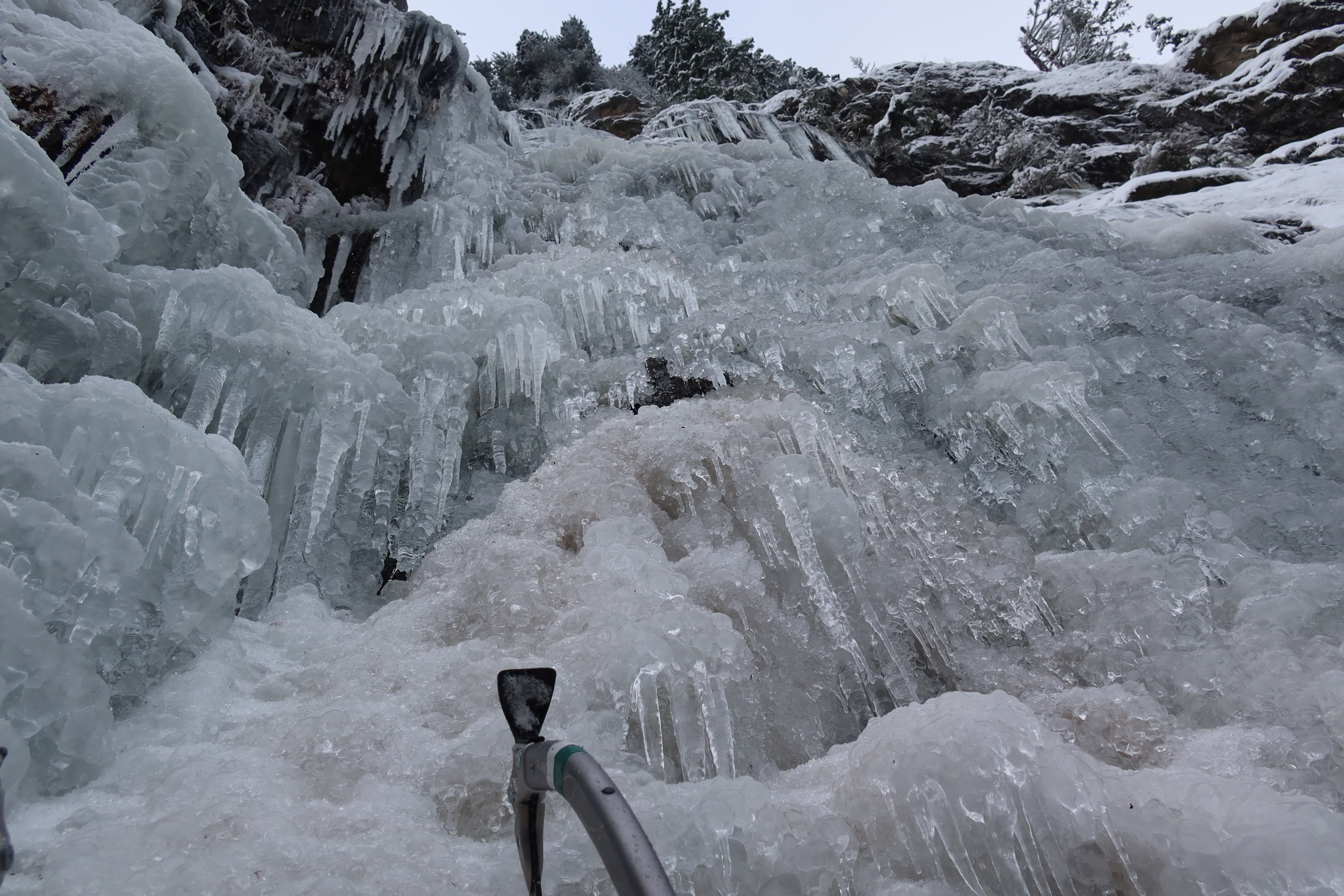We had been worried about screw lengths. We both owned a lot of long screws, which are appropriate for summer glacial ice, but we knew the ice here would be thinner and we didn’t want to be constantly bottoming out screws against the rock. Fortunately, between the two of us, we had a decent number of medium screws: 4x 16cm, 2x 13cm, and one stubby 10cm. We also had 3x 19cm and 4x 22cm screws, but those didn’t get used as much, the ice was rarely thick enough for them. The 16cm screws were definitely what we used the most. It would have been nice to have a few more of our screws be shorter. It would have really helped to have a second or maybe even third 10cm stubby.