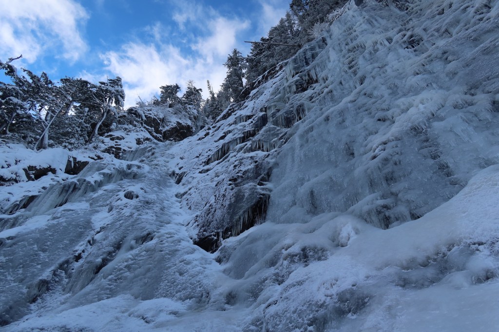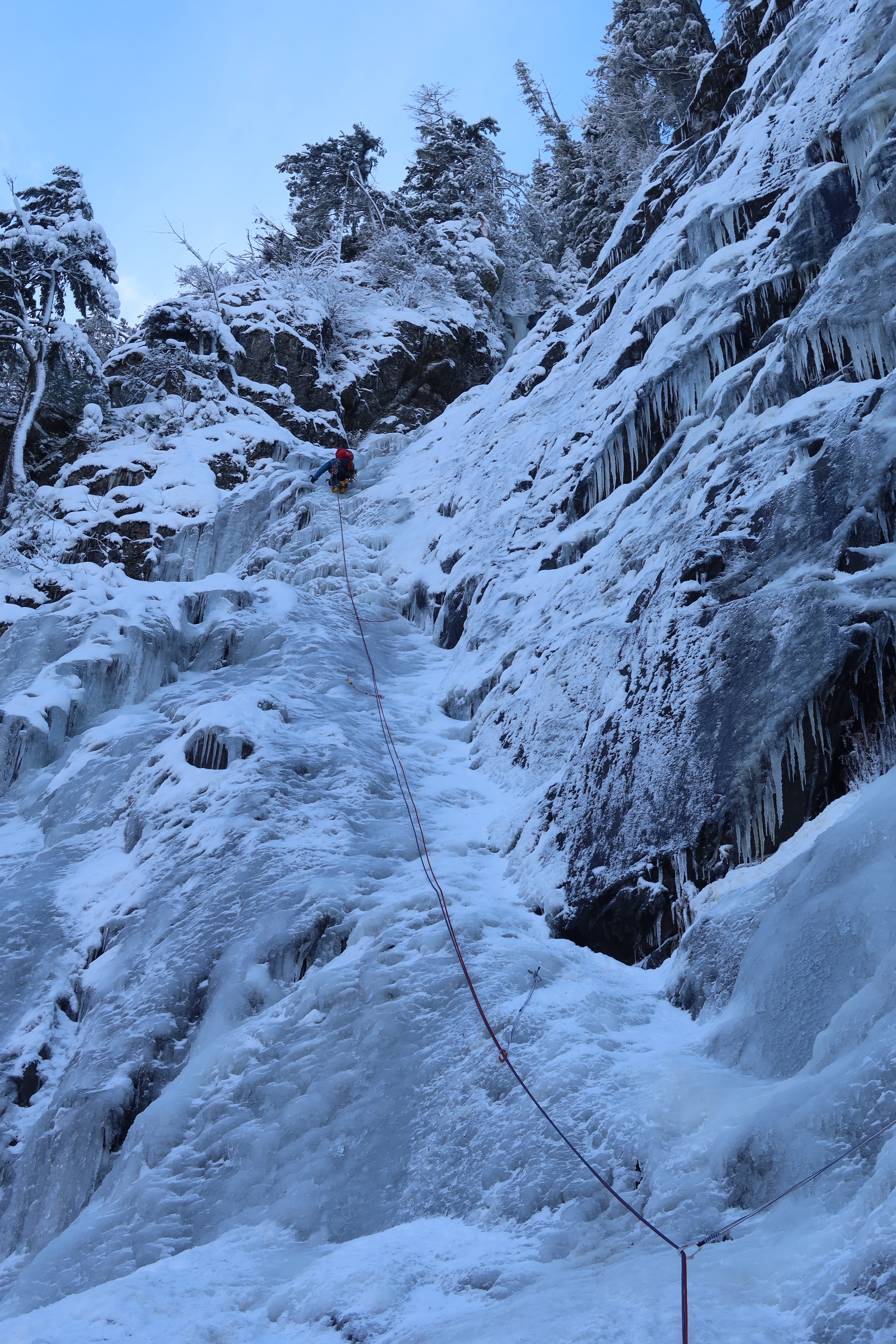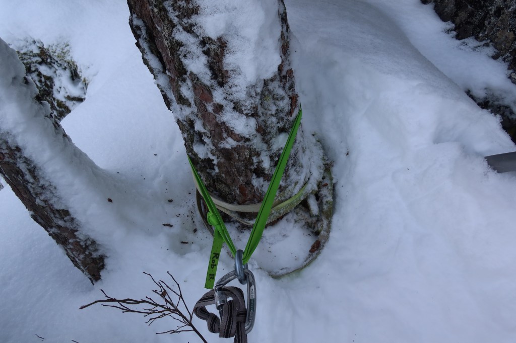 Once we were up here and could see it better, it became clear that this was as far up as we were climbing on this side. The ice above us would soon become disjoint, interrupted too often with just open water over bare rock, and the ice that was there was too thin. So, we needed to go back down. We certainly weren’t going to get a V-thread made in any of the ice here, so we needed something else to rap off of. Another 20-something feet beyond Chris were some trees up on the rock buttress, we agreed that a short pitch could be done to reach those. I led that and got us to our target tree, which unsurprisingly had faded white/yellow webbing already on it, so I built a new rap anchor and cut away the old stuff.