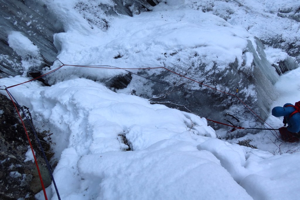 From there, we rappelled back to the ledge where I had ended the first pitch. I was too hasty throwing the rappel ropes, didn’t coil them neatly before throwing, and paid for that time many times over trying to untangle the rats-nest of twin ropes throughout most of my rappel. We didn’t quite reach the spot I had belayed from before, but we did manage to find a place with good ice where a V-thread was possible. As we were pulling our rappel rope, I brought up the idea of possibly doing a third pitch of the day from here, climbing the WI3 that was straight up from this point. However, when we checked our watches, it turned out it was later in the day than we realized, and we agreed it was time to be going down. Unfortunately, during this, the untieing of one stopper-knot in the rappel rope was forgotten, and it turns out the rappel rope wasn’t coming down anyway. So, for better or for worse, I got to lead one more pitch anyway, repeating our pitch 2, and once again at the top rapping of the same tree.