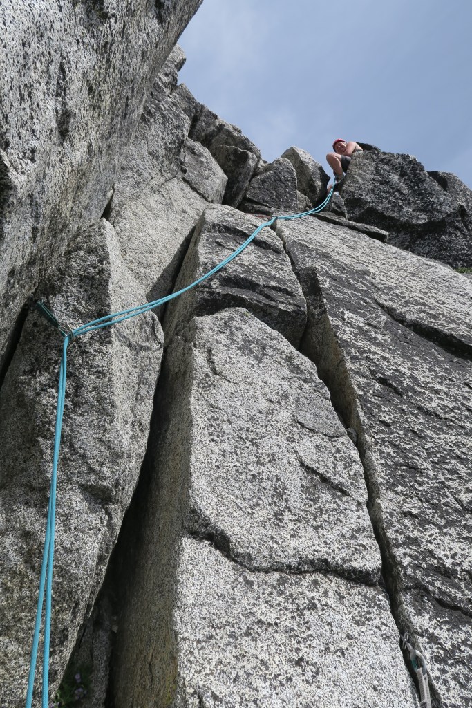 - You could get away with breaking some “rules” a bit, taking a single-strand of a skinny rope rated as a “half-rope”, and pretending it’s rated as a “single-rope,” just using it as a single-strand. For example, I have a 40-meter 8.4mm Sterling Evolution Duetto, which weighs 4.0lbs, and I’ve historically used it as a glacier or scramble rope. It also worked perfectly as a rope for the climbing portion of the West Ridge for me, but it depends on your personal comfort-level here, you should understand exactly what “rules” are being broken. It’s not a “single-rated” rope, it is not designed to take the kind of big whippers that could happen in more vertical rock climbing. Single-rated ropes pass a certification that guarantees that they’ll survive 5+ near-worst-case-scenario vertical falls in a row with the same spot in the rope being loaded over a carabiner every time, with an 80-kilogram falling test mass. Half-rope certification is a similar test, still testing one-strand, but with a 55-kilogram test mass. Twin-rope certification is a similar test, but uses two strands together to catch the 80-kilogram test mass. So half-ropes do get tested with a single strand, but aren’t expected to hold as much. On mostly scrambly less-than-vertical alpine rock, like the West Ridge of Stuart, falls are more tumbly, less acceleration than a vertical free fall, so the half-rope’s lesser certification is probably enough. Just know that “probably” is pretty hand-wavy here. Also, looking at the forces in the falls is probably secondary here anyway. What’s far more important is: how likely is it your rope could be cut by a sharp rock? To mitigate rope-cutting-risk, be careful what diameter you choose, and don’t go too skinny. The skinnier the rope, the less material in there that would have to be damaged before a cut goes all the way through. I have no idea how skinny is “too skinny”, but FWIW, I felt good about the 8.4mm diameter that I had, but personally I wouldn’t go much skinnier when using a single strand at a time.