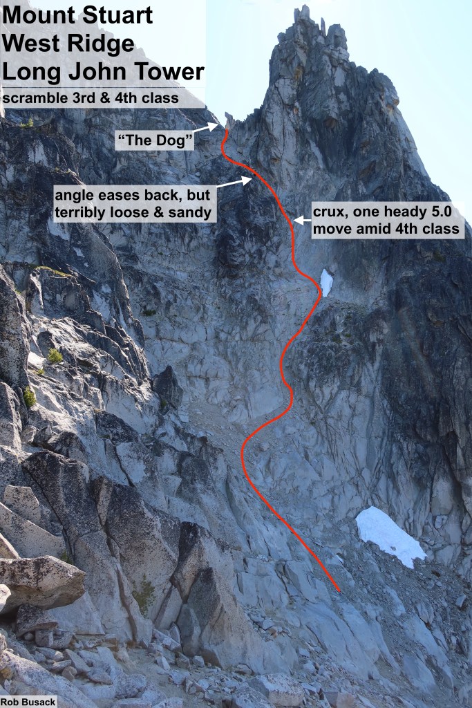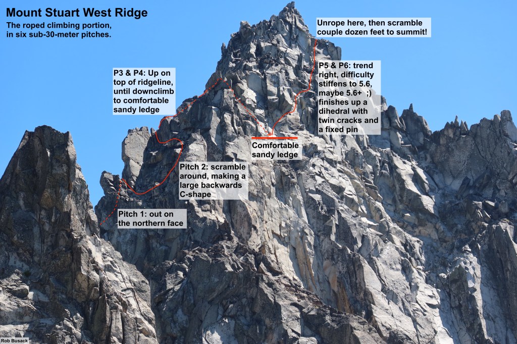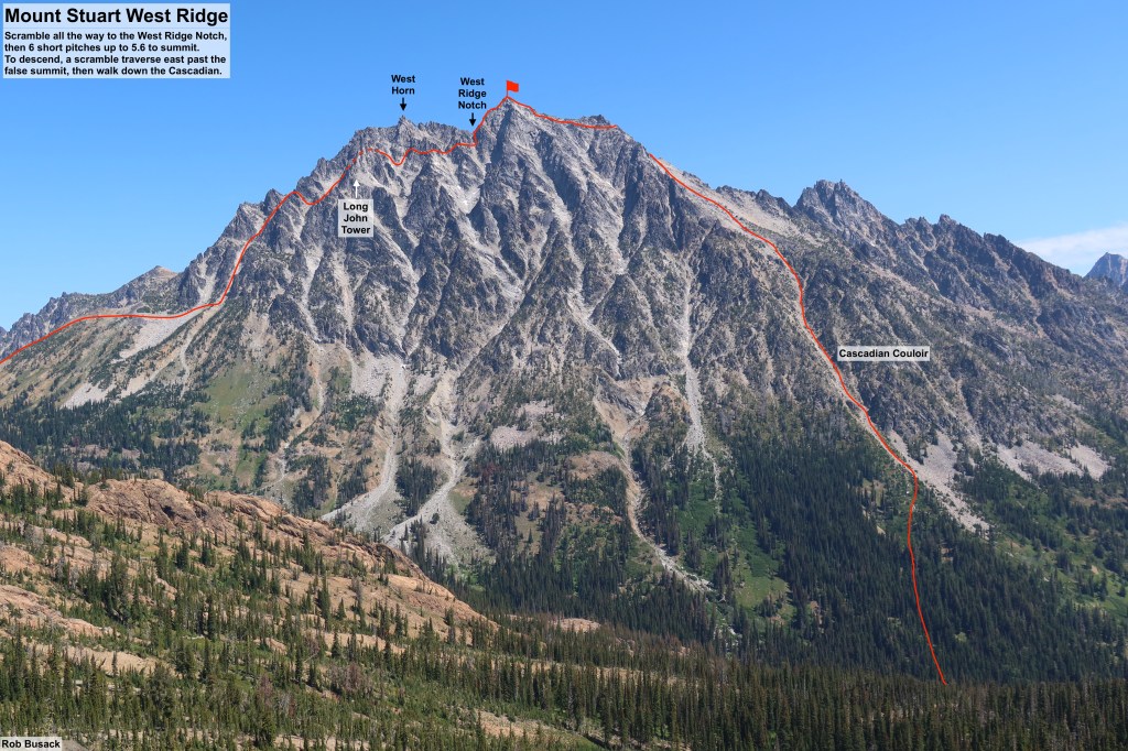 Mount Stuart is my favorite mountain, and has been for a long time. Way back when I was just a hiker & backpacker, I loved the look of it, it was so imposing. Unknowingly influenced by the way things appear steeper than they really are when viewed face-on from far away, I never imagined it was something I’d ever actually be able to go up. Then, early in my mountaineering career, on the first weekend of June 2012, my mentor Karl took me up the Cascadian Couloir to the summit, blowing my mind about what was possible as a “scramble”. A heavy snowpack back then even made the Cascadian Couloir oddly delightful: solid kick-stepping the whole way up, and it was the second-best long glissade of my life going back down, second only to the south side of Adams the year prior. (Though the climate has changed noticeably since then, and it would be much more difficult to see enough lasting snow for glissade conditions like that on Stuart ever again.) Since then, I’ve now been to the summit of Stuart five different times, all of which are very memorable to me, and three of which have been via the West Ridge. Given the complicated route-finding of the West Ridge, I wanted to put some notes out there for the benefit of friends who have yet to climb it.