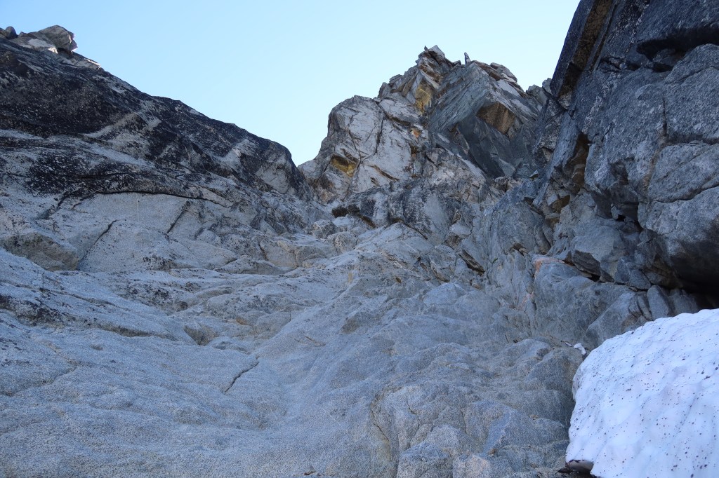 - 8:00am – reach the base of the white granite gulley, the 2nd gulley from the west. This is where the real scrambling starts. It’s 3rd/4th class, but on beautifully clean white granite that’s such good rock quality, it’s possibly the only place I’ve really enjoyed 4th class scrambling!