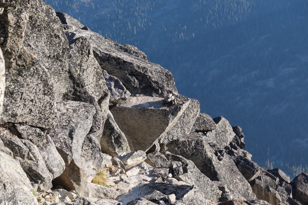 - From the summit back to the trailhead: The descent is a scramble-off, traversing scramble (3rd & 2nd class) from true-summit to false-summit, then descend ~4000′ down the Cascadian Couloir (yes, it’s rocky & sandy, but the CC is not as bad as many people say it is.) Back on trail, regain 1400′, then descend 2000′. (GPX track for Cascadian Couloir)
