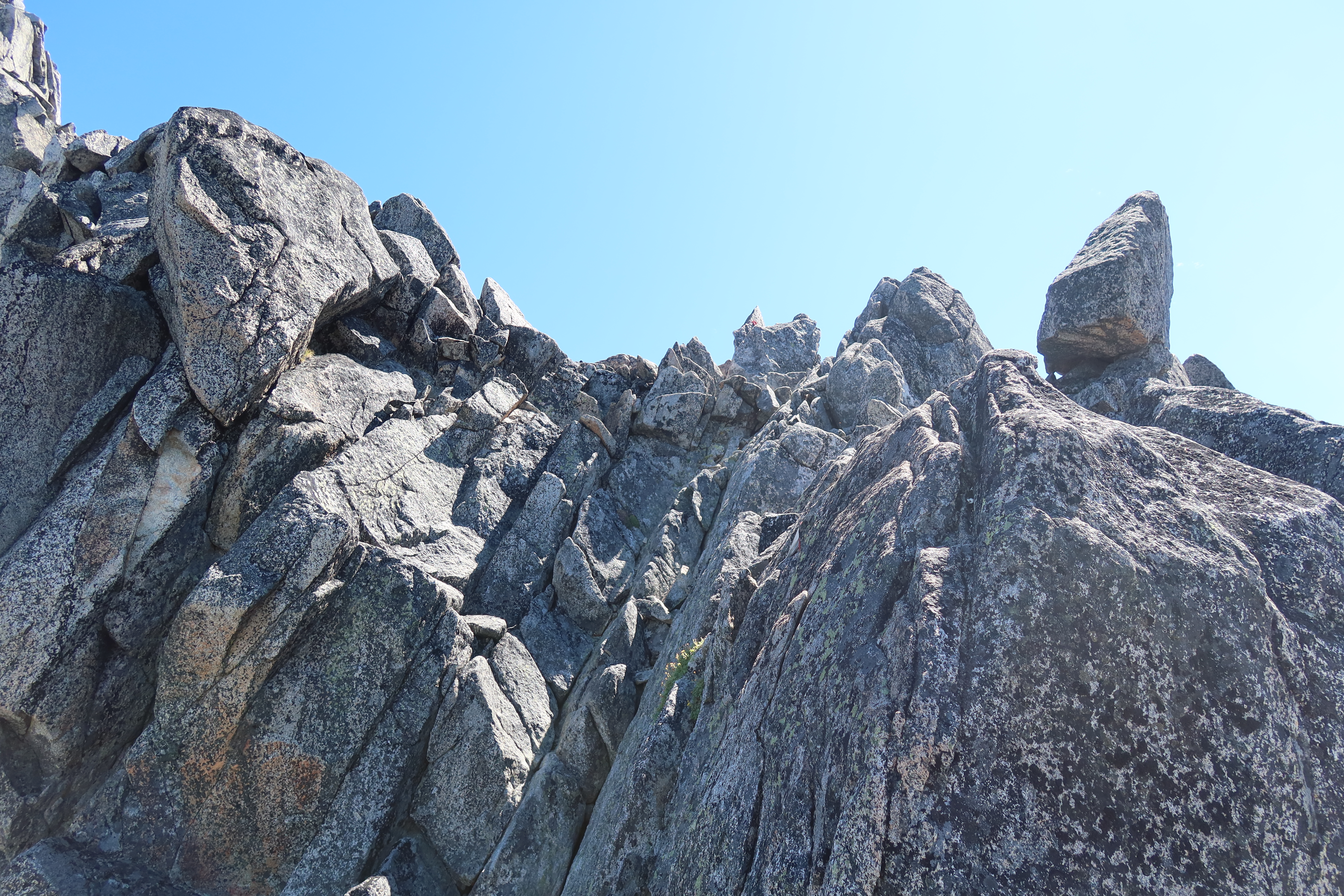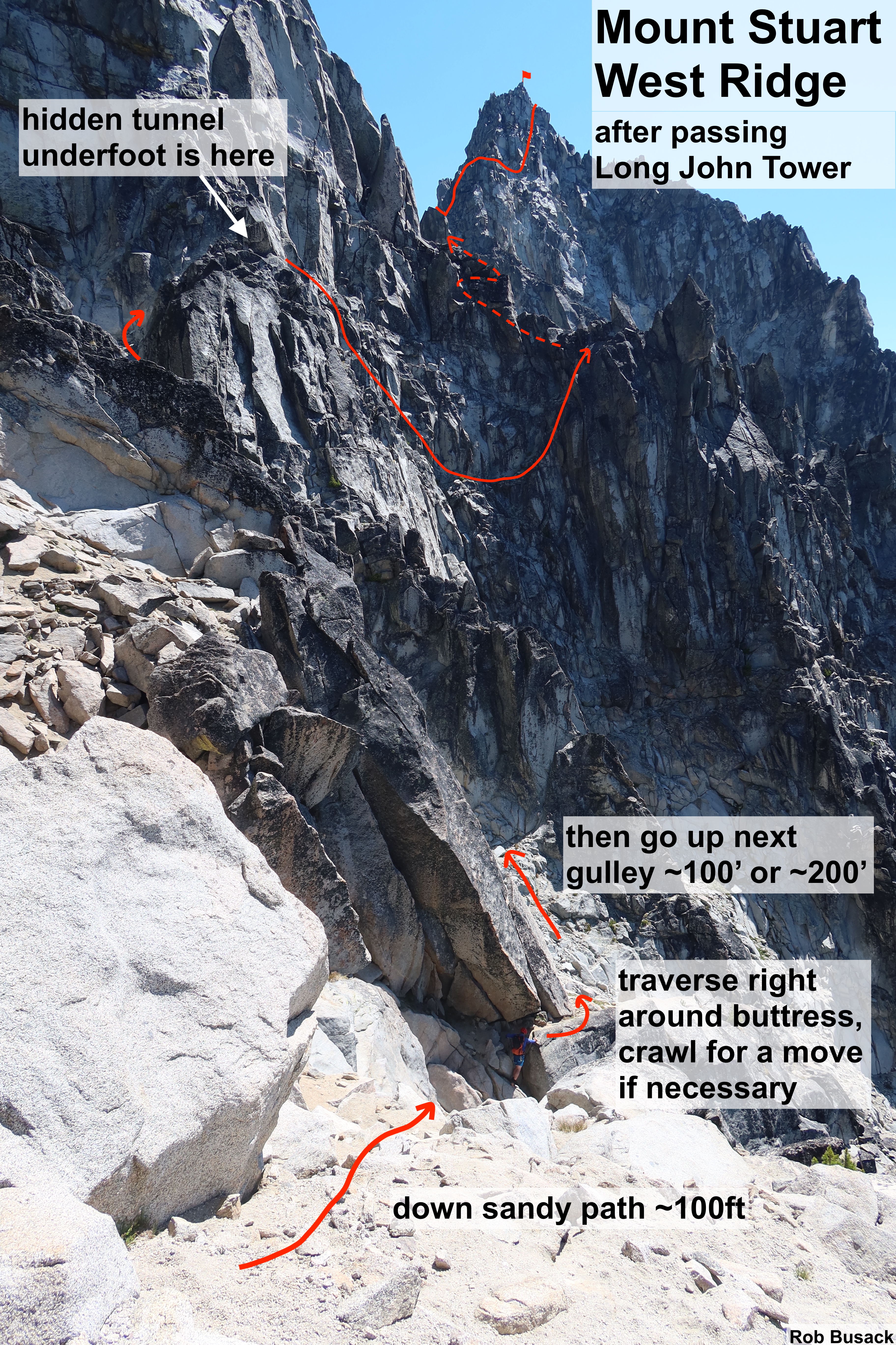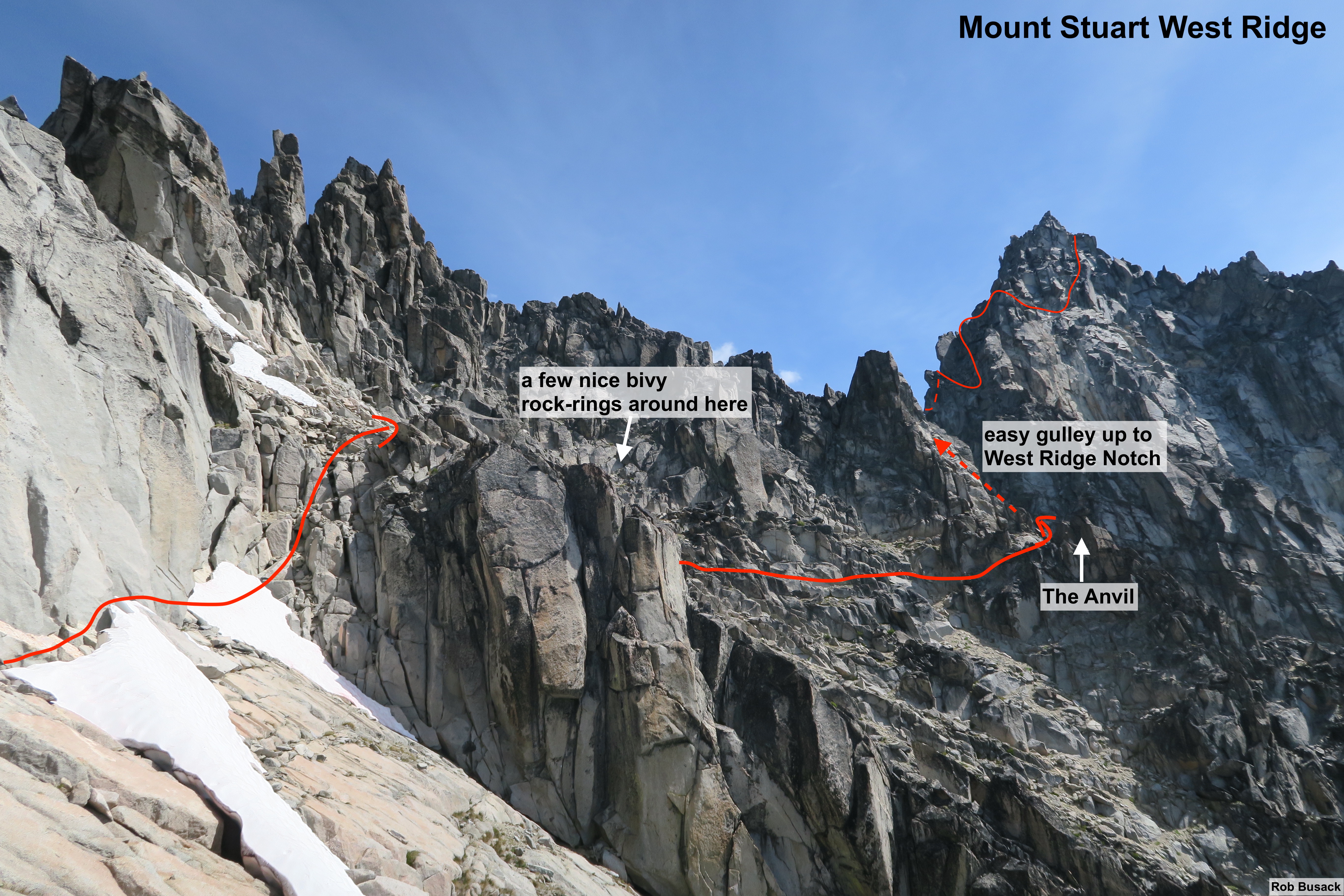 - after that, I always take the low-route, and there’s some crazy route finding, involving a hidden tunnel, a butt-scooch slab, another tunnel, past some bivy sites, past a cool anvil-shaped balanced rock, then up a relatively-easy gulley to arrive at the West Ridge Notch. This part is the most complicated route-finding. You should probably bring a copy of this trip report by “Cluck” https://cascadeclimbers.com/forum/topic/44925-stuart-west-ridge-more-beta-than-you-can-use/