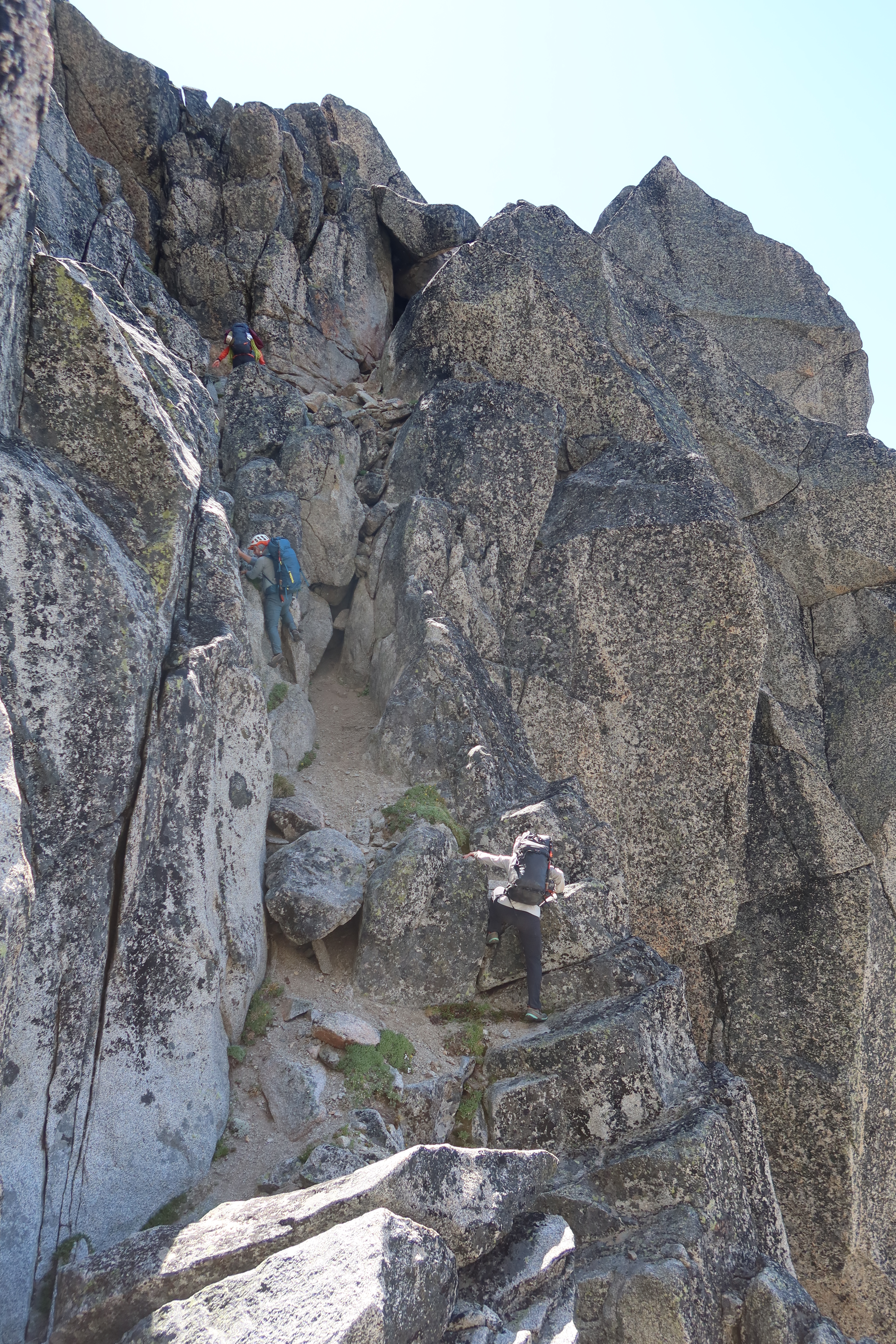 - 8:00am – reach the base of the white granite gulley, the 2nd gulley from the west. This is where the real scrambling starts. It’s 3rd/4th class, but on beautifully clean white granite that’s such good rock quality, it’s possibly the only place I’ve really enjoyed 4th class scrambling!
