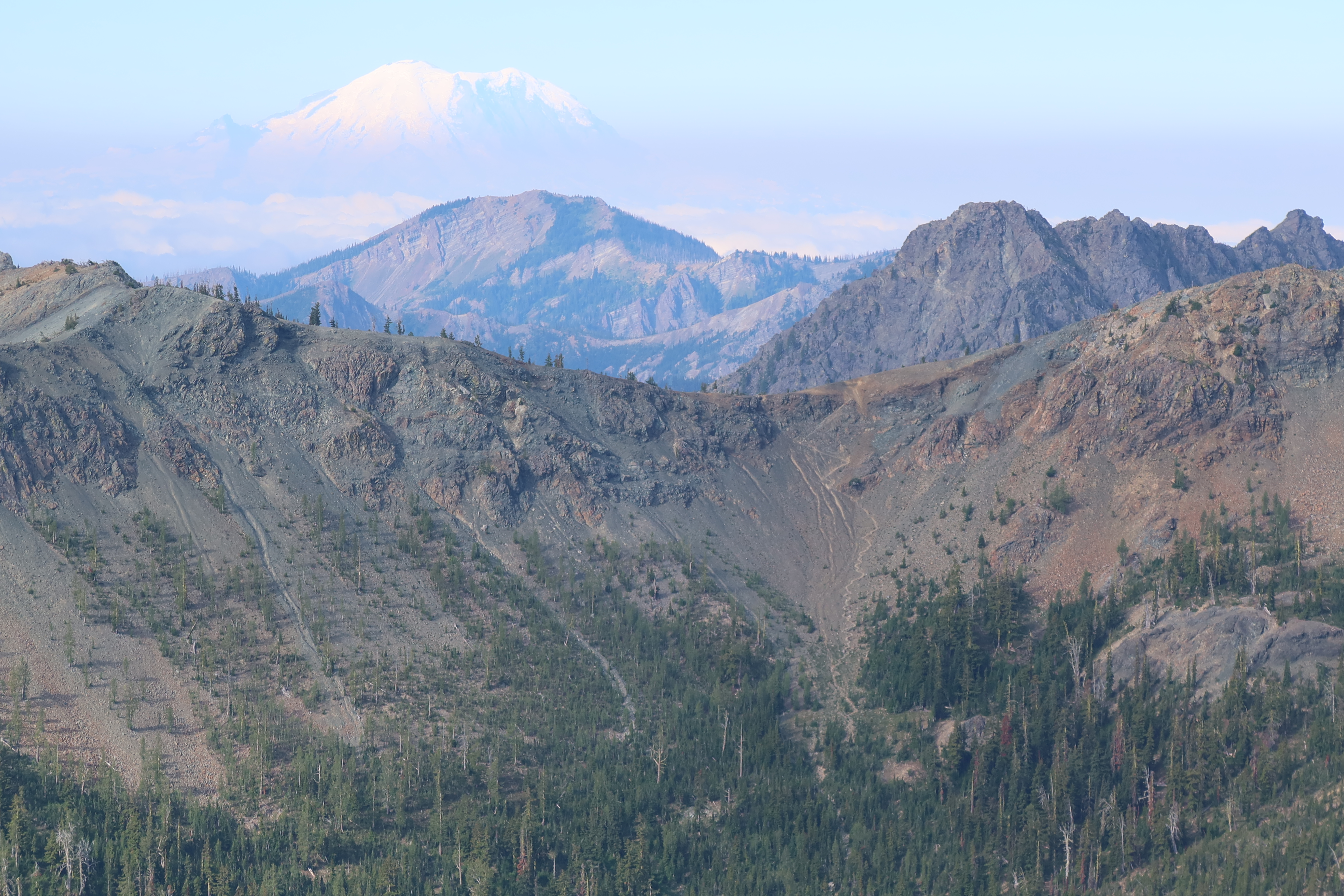 - From the summit back to the trailhead: The descent is a scramble-off, traversing scramble (3rd & 2nd class) from true-summit to false-summit, then descend ~4000′ down the Cascadian Couloir (yes, it’s rocky & sandy, but the CC is not as bad as many people say it is.) Back on trail, regain 1400′, then descend 2000′. (GPX track for Cascadian Couloir)