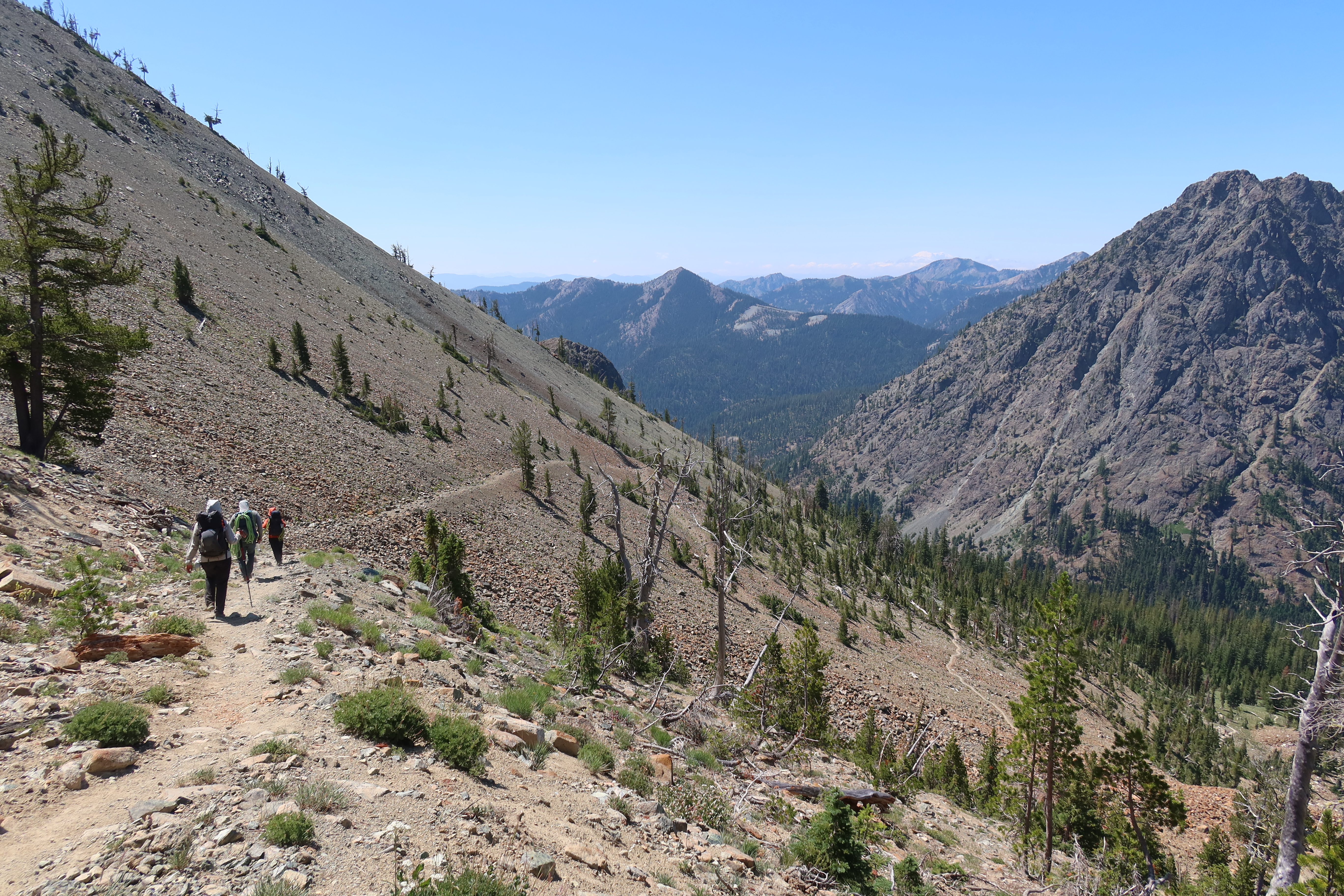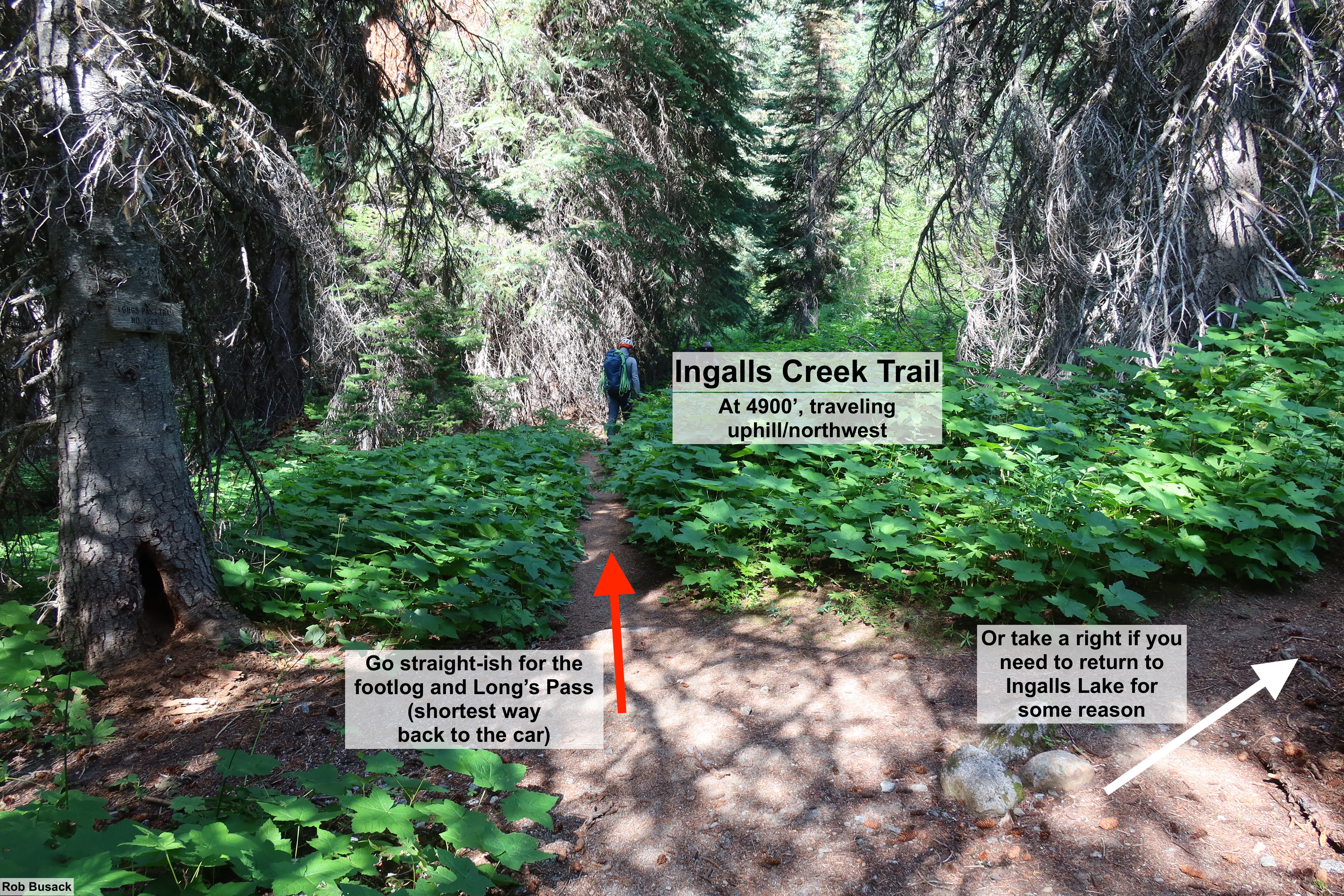 - Sunday: Complete however much is left, cross Ingalls Creek at the footlog at 47.45628, -120.91103, regain an annoying 1400′ of elevation to go up and over Long’s Pass, skedaddle down other hot & dusty trails back to the parking lot!