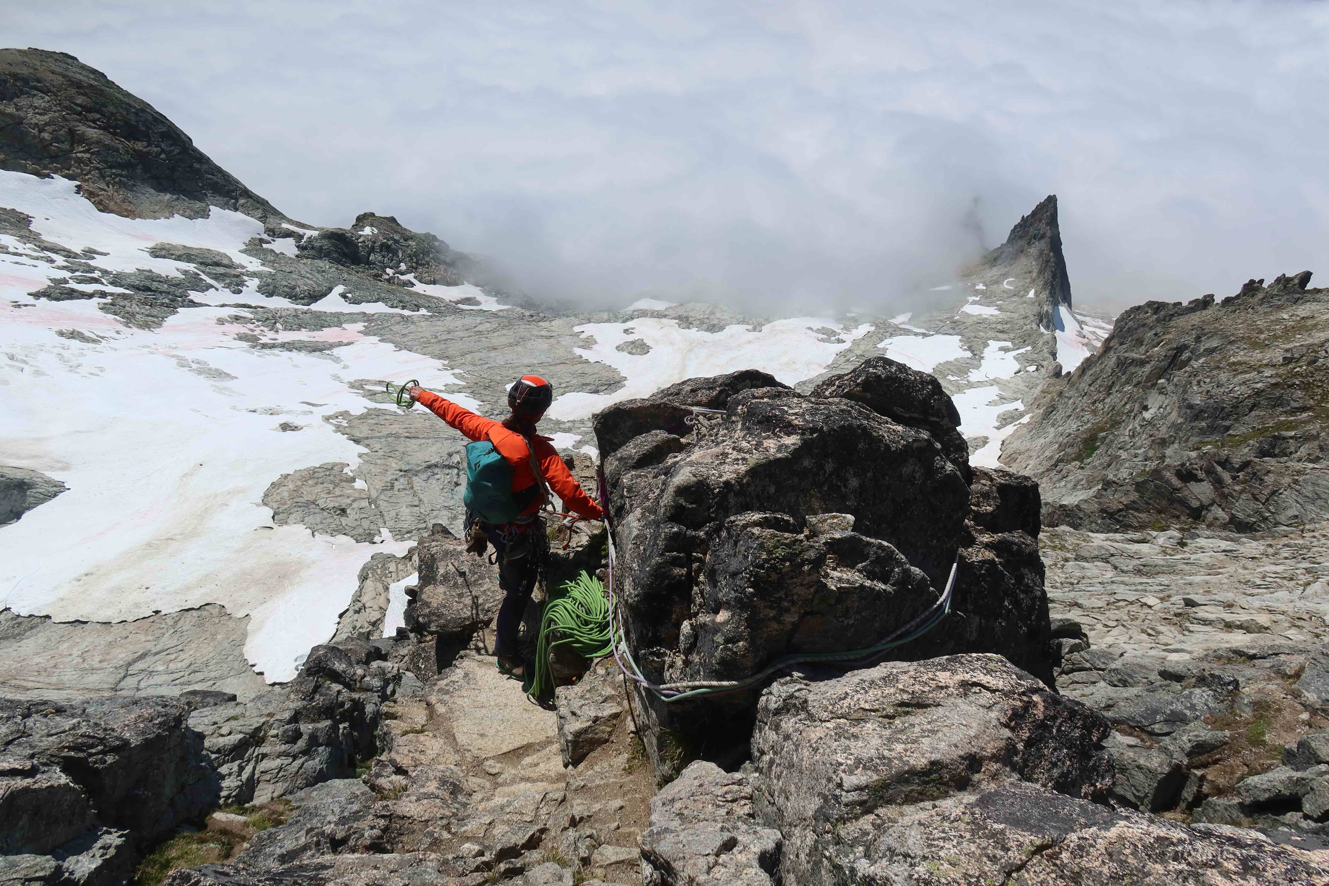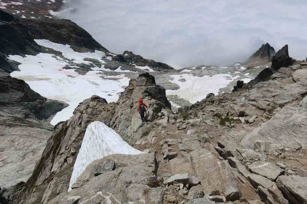 - ice axe for sure. Even in later season (mid-July & onward), you’ll still have to cross a little snow near the end of the approach, to reach the base of the Cat Scratch Gullies. That last bit of snow is steep enough that you’ll definitely want the ability to self-belay and self-arrest in order to cross it safely. In mid-July, I found a single basic ice axe (CAMP Corsa Nanotech) was perfect. I’ve seen photos from early-season trip reports where people had a second axe or perhaps even an ice tool, so that may or may not be needed early season, but I haven’t personally been out there any earlier than July, so I don’t know firsthand.