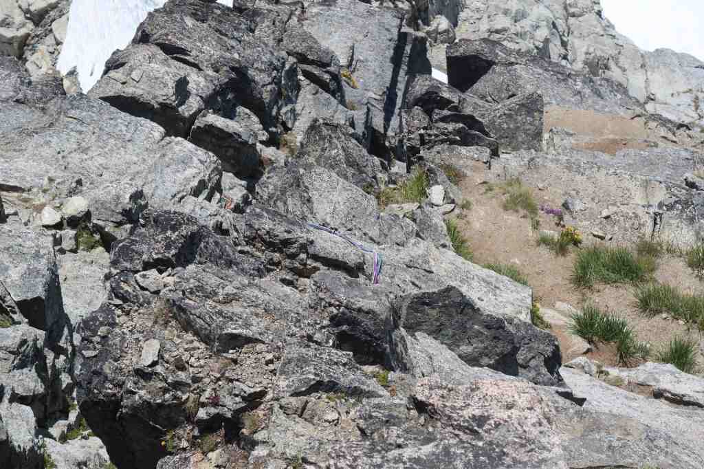 - Once back at the West Ridge Notch, unrope, and scramble down about ~200′ in elevation to the first rappel station for the Cat Scratch Gullies. Five <30m rappels from there will return to bottom of the Cat Scratch Gullies.