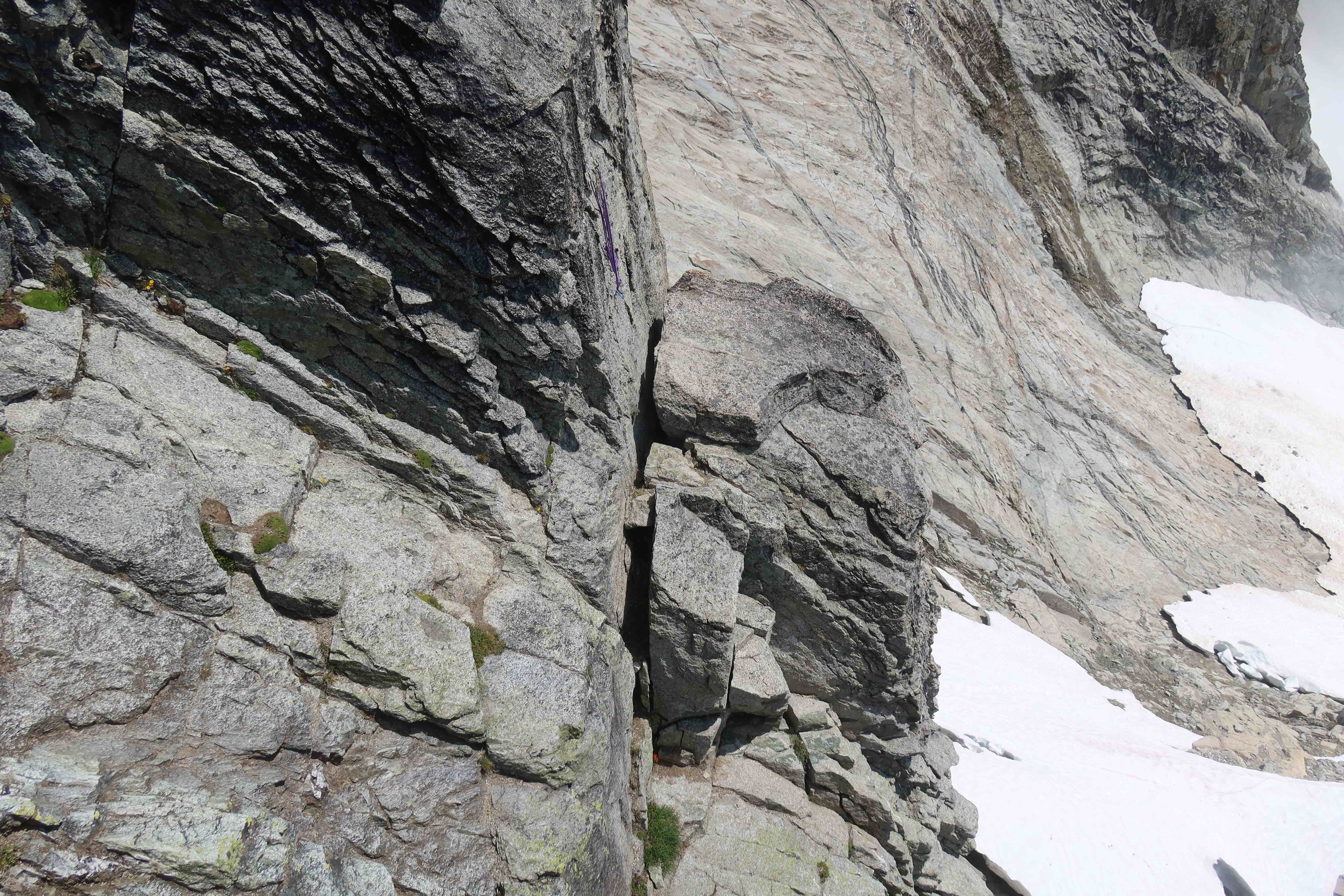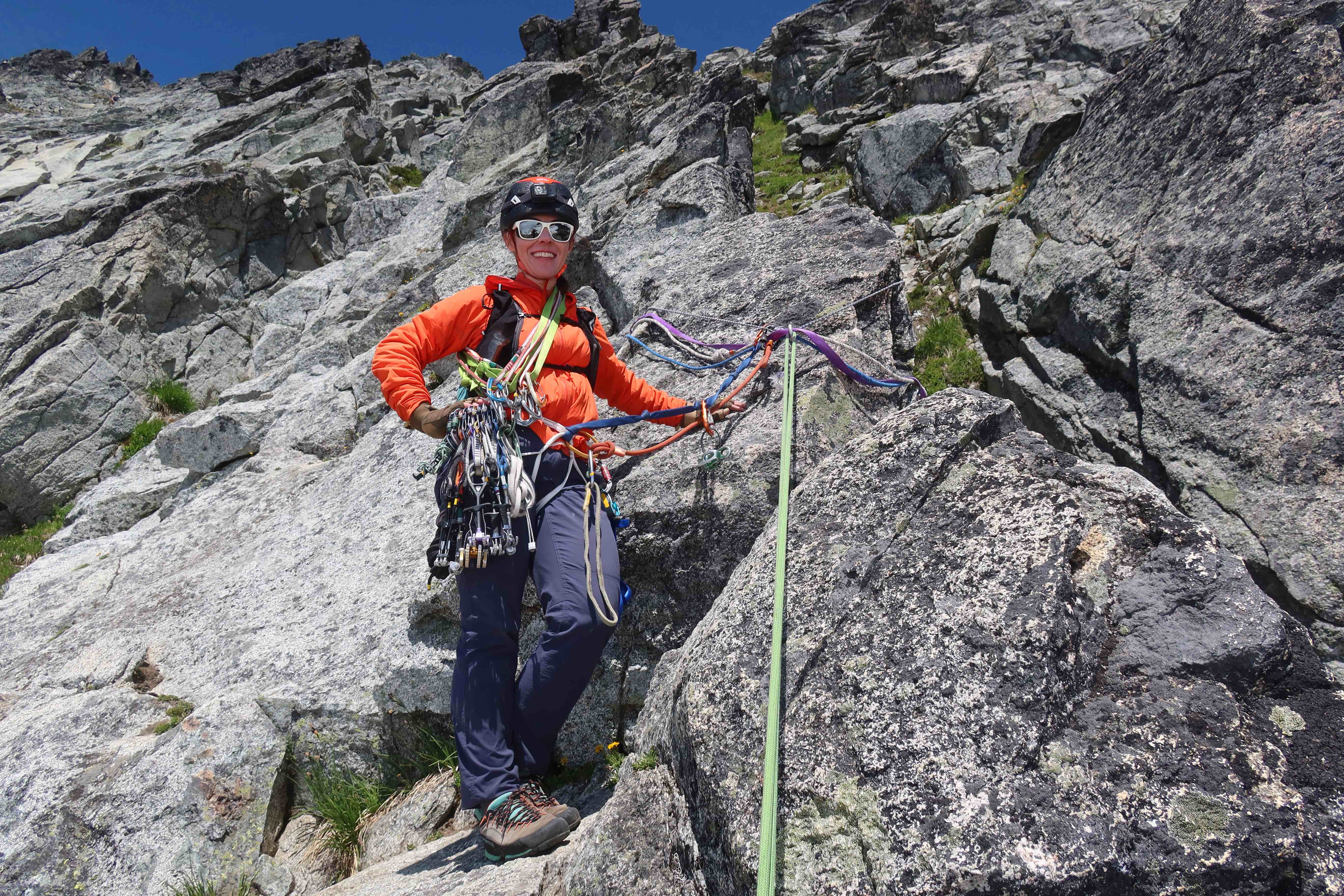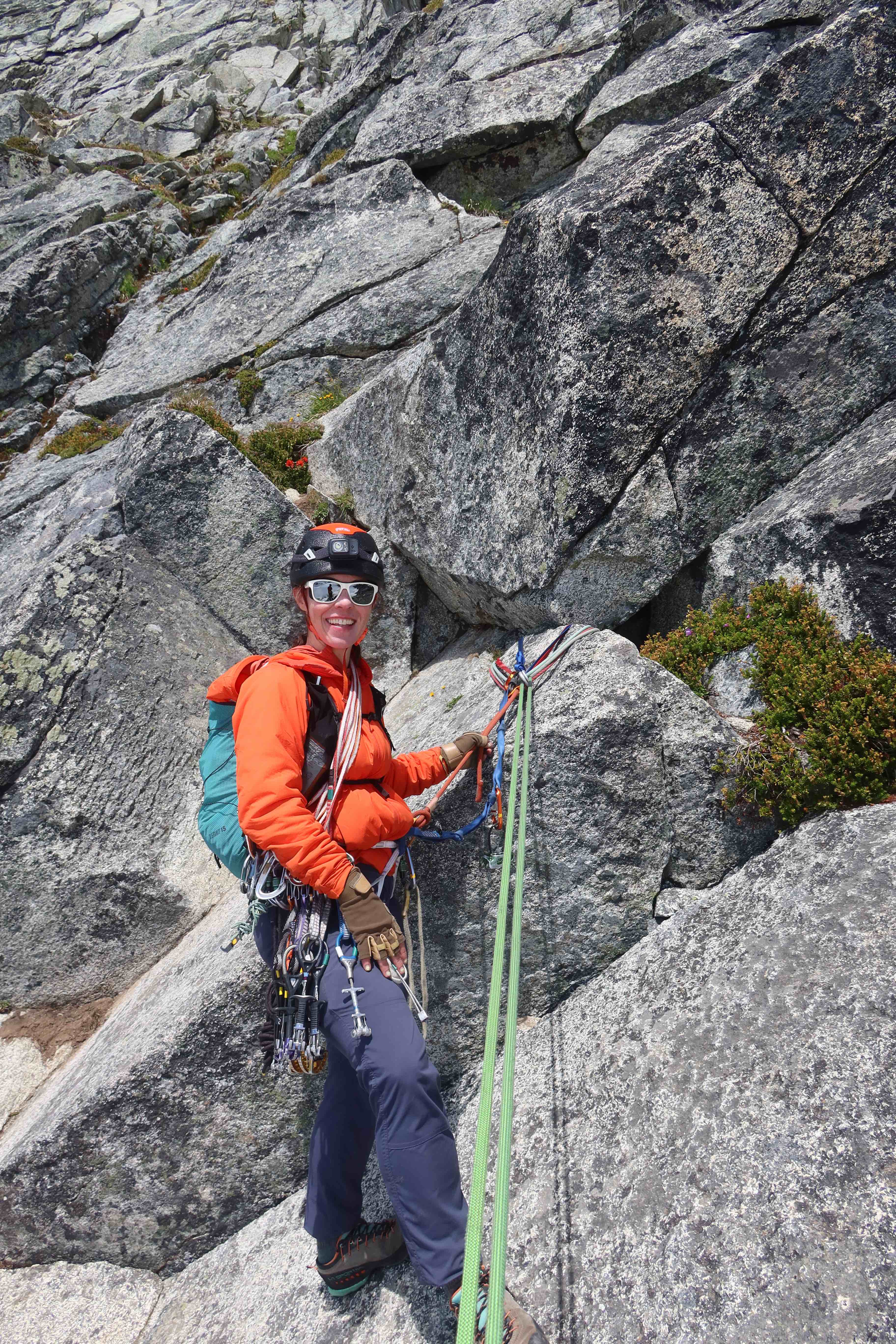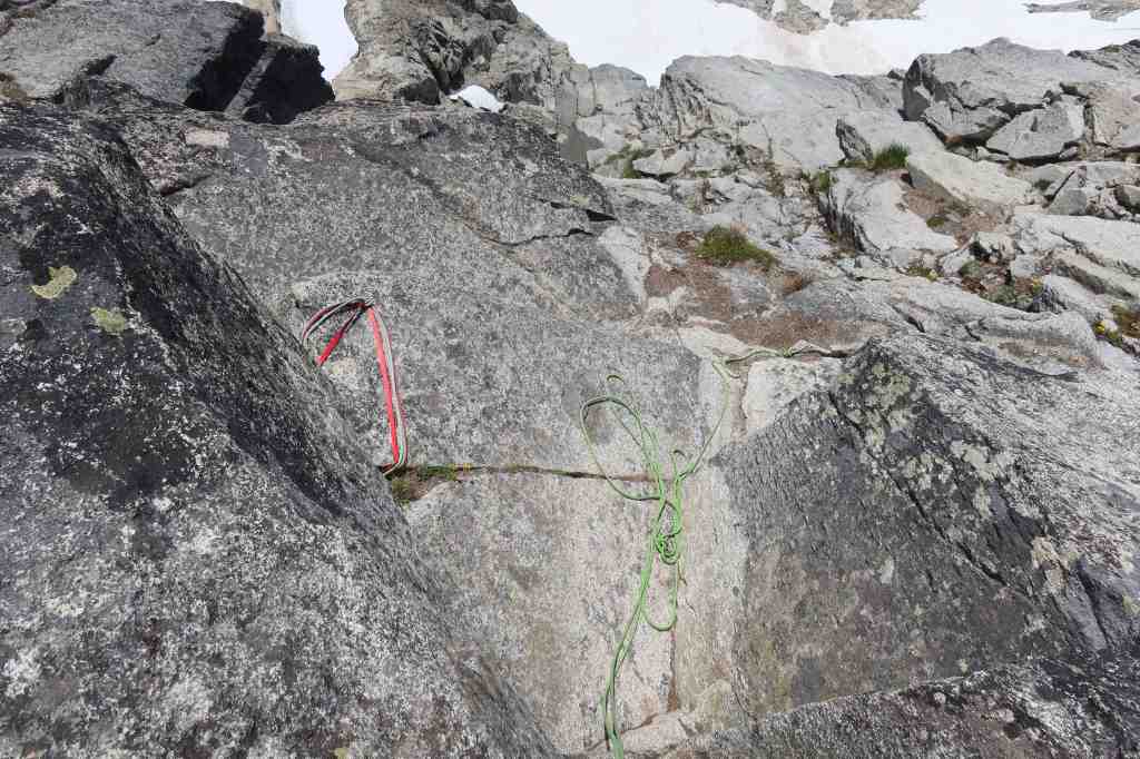 - Rack: It doesn’t matter too much, no specific pro size is make-or-break here. Many people do singles of BD cam sizes #0.2 to #2, a set of nuts, and many many slings, and that works well. I happened to also bring a BD #3, and if you’ve got it, there certainly are places to put it, but it’s never a critical size. Doubling-up cam sizes is not necessary, but if you really wanted to double up, the most-used sizes are around #0.5 purple and #0.75 green. Having A LOT of slings is fairly important, both to allow long simul-pitches, and because a ton of your pro will be natural opportunities to sling rock horns with double-runners. I recommend having 8 single-runners and 8 double-runners. (Yes, 8 double-runners!) Normally for something this alpine, I strip a bunch of carabiners to save weight, having a single-carabiner on each sling, instead of having every sling be an alpine-draw with two carabiners. However, after having done that, I ended up wishing I had way more carabiners anyway. I placed nuts surprisingly frequently and needed two carabiners per runner a lot more often than I expected. Also, there’s a lot of extraneous rappel anchors strewn about, and any time I passed one, it was an easy thing to clip as pro, but that also needed two carabiners per runner. So, don’t skimp too much on the number of carabiners.