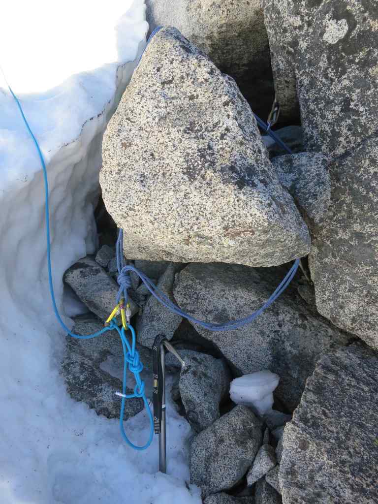 - The first & trickiest decision is to decide where the fixed-line should go. Particulary, where exactly to put your first anchor, and thus start your fixed-line from. Prior research & beta helps a lot here. Otherwise: if you know where you need to go, and where the location of the fall-hazard of concern is, you’ll have to eyeball how close to all that you’ll need to be for your length of rope to entirely reach. Then, search for something that can actually be used as an anchor. Anything you might use as an anchor in the alpine is valid: a rock horn you could sling with a cordelette, or a buried picket, or multi-piece trad anchor, etc.