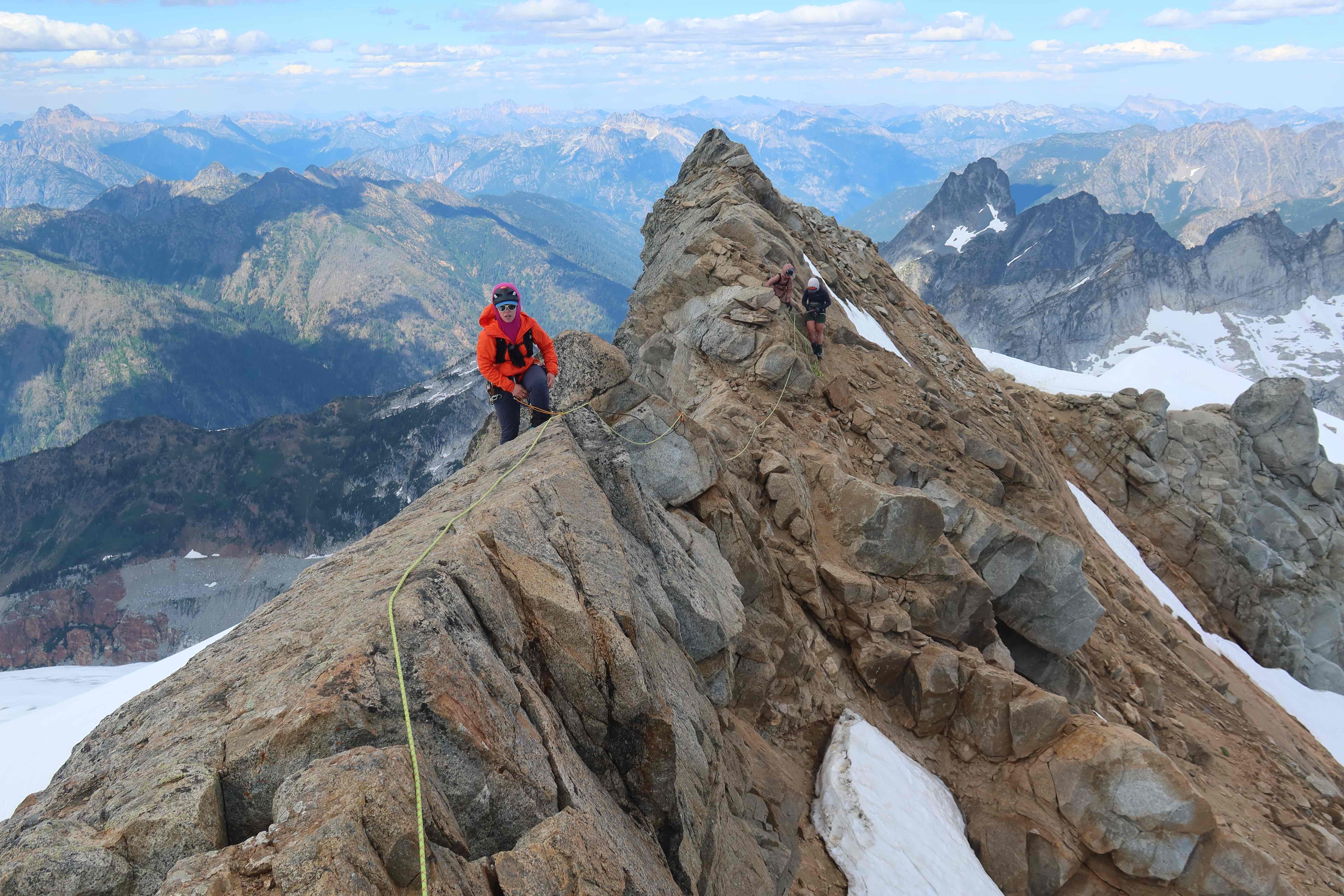 I climb a lot in Washington’s Cascades, and I do a lot with the Seattle Mountaineers. So, often enough, I end up having to manage a group in terrain that’s a little too high on difficulty or exposure to be something I’d want to scramble unroped, but not long or hard enough to treat like a full-on multipitch rock climb either. This middle ground can be an excellent time to make use of a fixed-line, particularly if your group-size is any larger than a party of two. By “fixed line”, I mean a situation where you or someone in your group has taken a climbing rope, and fixed it in place, with a hard-knot to an anchor at at-least one end, though almost-always preferably both ends. The rope doesn’t move, but people move along it.